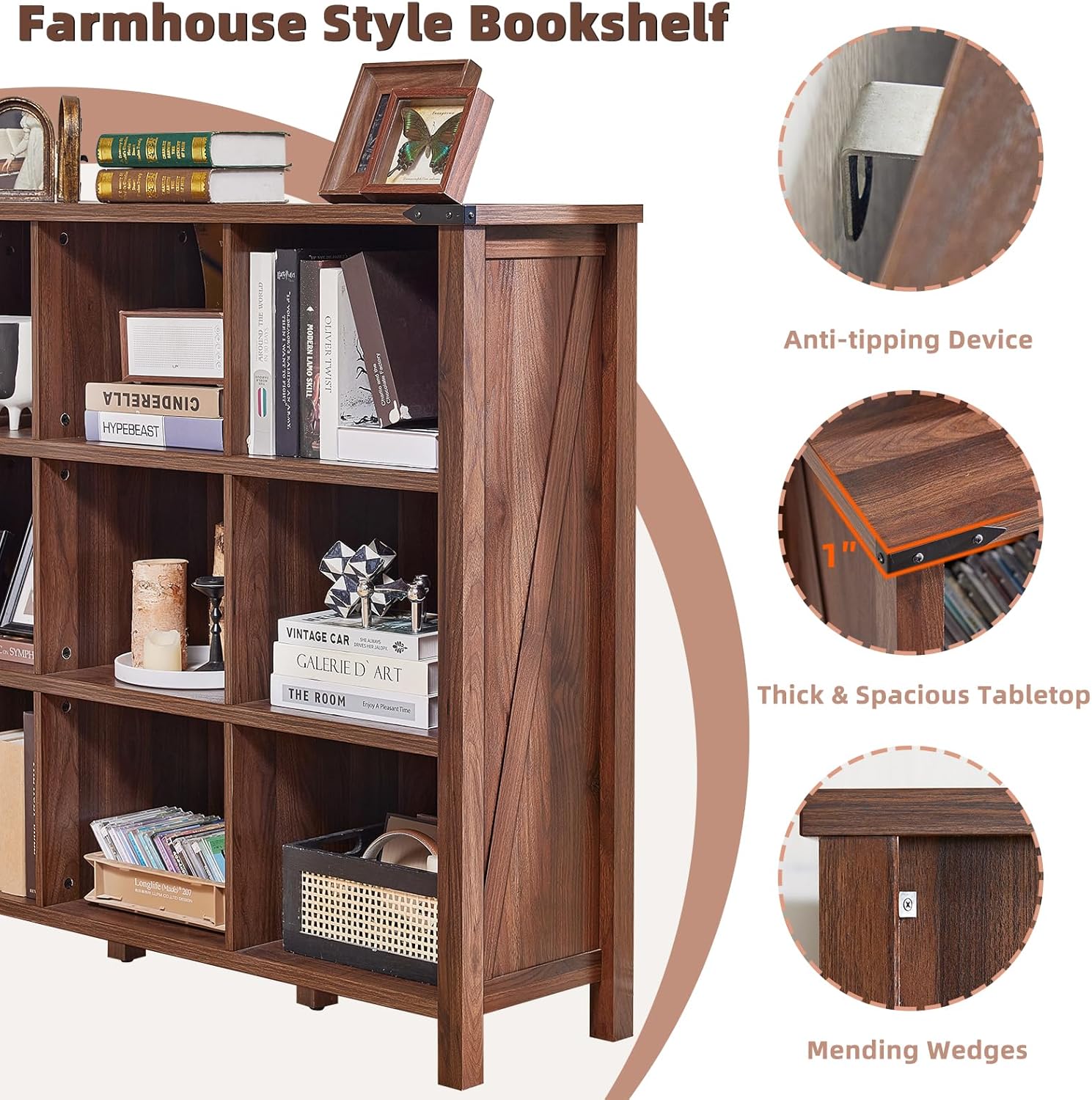 9 Cube Bookcase, Farmhouse 47 Inch Wide Brown Walnut Bookshelf, Wooden 3 Tier Display Large Open Book Shelf, Vintage Horizontal Book Case for Home Office, Cubby Storage Cabinet for Living Room