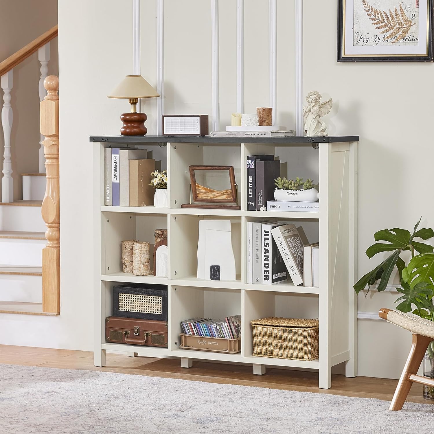 9 Cube Bookcase, Farmhouse 47 Inch Wide White Bookshelf, Wooden 3 Tier Display Large Open Book Shelf, Vintage Horizontal Book Case for Home Office, Cubby Storage Cabinet for Living Room