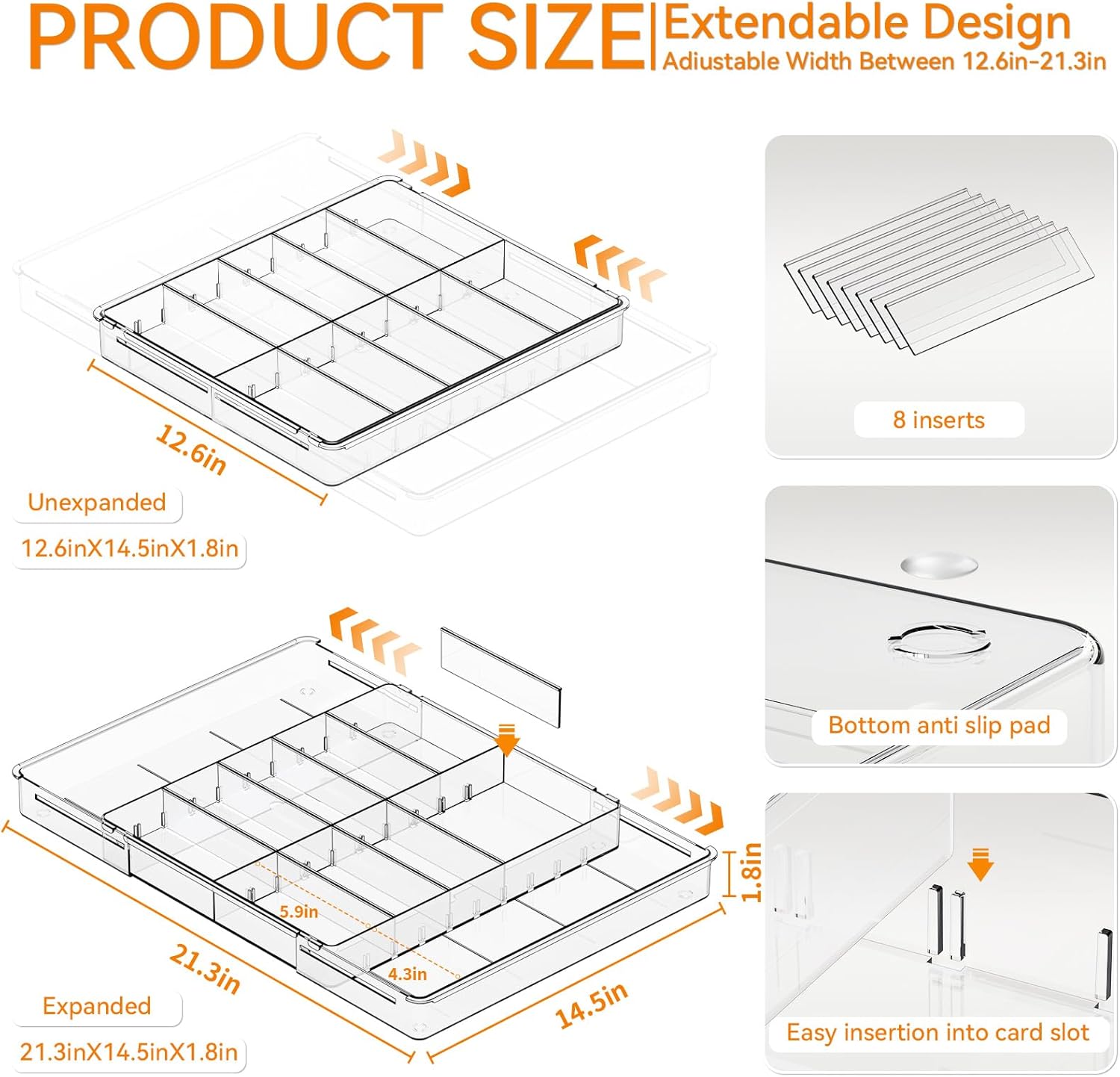Yieach Large Expandable Desk Drawer Organizer Tray for Office Supplies and Accessories With 12 Adjustable Compartments,Office Drawer Organizers for Pencil,Pen and Kitchen Junk Drawer Organizer,Clear
