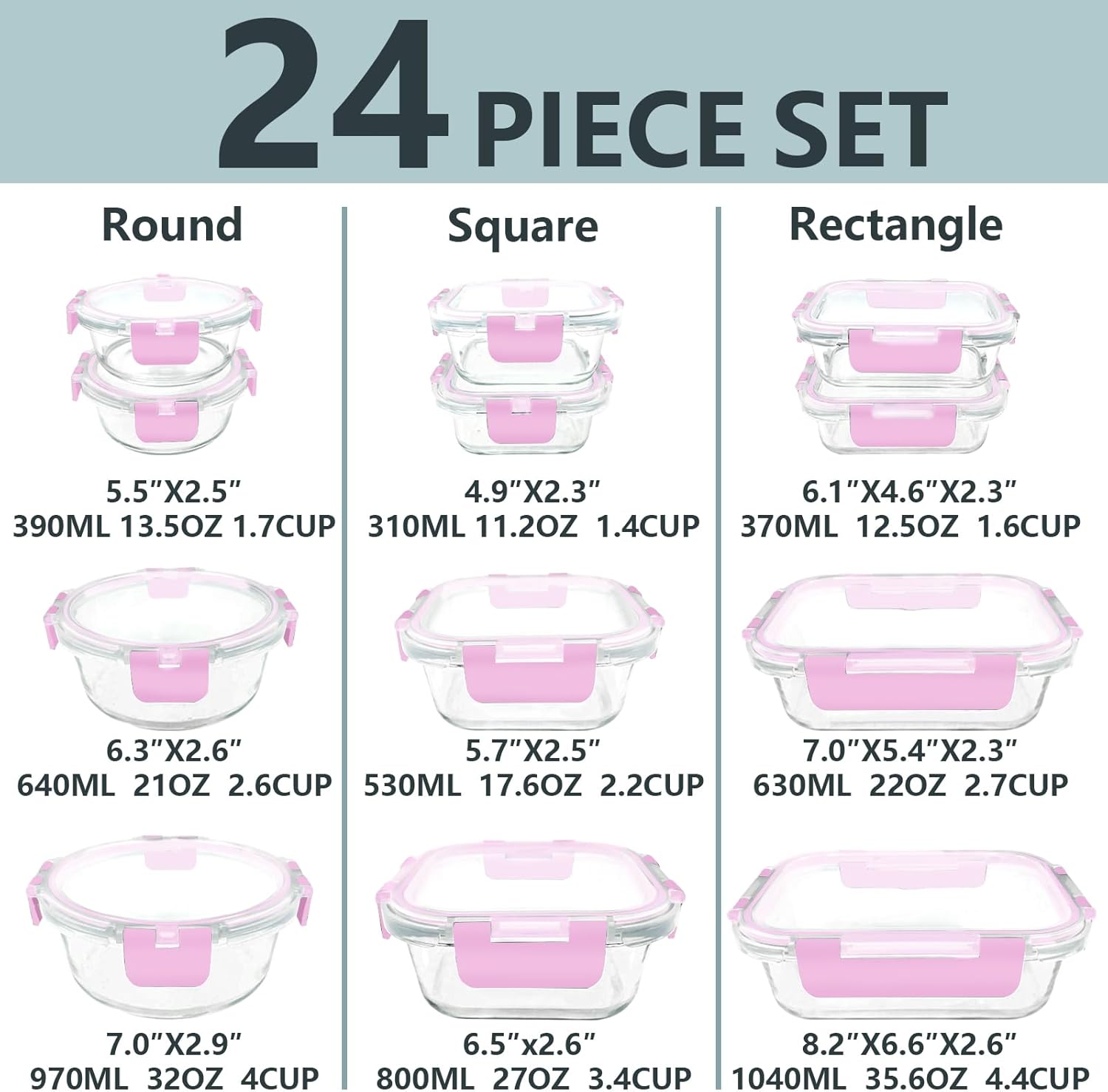 - 24 Pieces Glass Storage Container Set: This set includes 12 𝒑𝒊𝒆𝒄𝒆𝒔 𝒈𝒍𝒂𝒔𝒔 𝒄𝒐𝒏𝒕𝒂𝒊𝒏𝒆𝒓𝒔 𝒂𝒏𝒅 12 𝒑𝒊𝒆𝒄𝒆𝒔 𝒑𝒍𝒂𝒔𝒕𝒊𝒄 𝒍𝒊𝒅𝒔 with multiple sizes and shapes to fulfill your storage requirement, perfect for all your food storage needs. Package includes: Rectangular (1040ml,35.6 oz, 4.4cup/630ml, 22oz, 2.7cup/370ml, 12.5oz ,1.6cup), Square (800ml, 27oz, 3.4cup/530ml, 17.6oz, 2.2cup/310ml, 11.2oz, 1.4cup), and Round (970ml, 32oz, 4cup/640ml, 21 oz, 2.6cup/390ml, 13.5oz, 1.7cup).