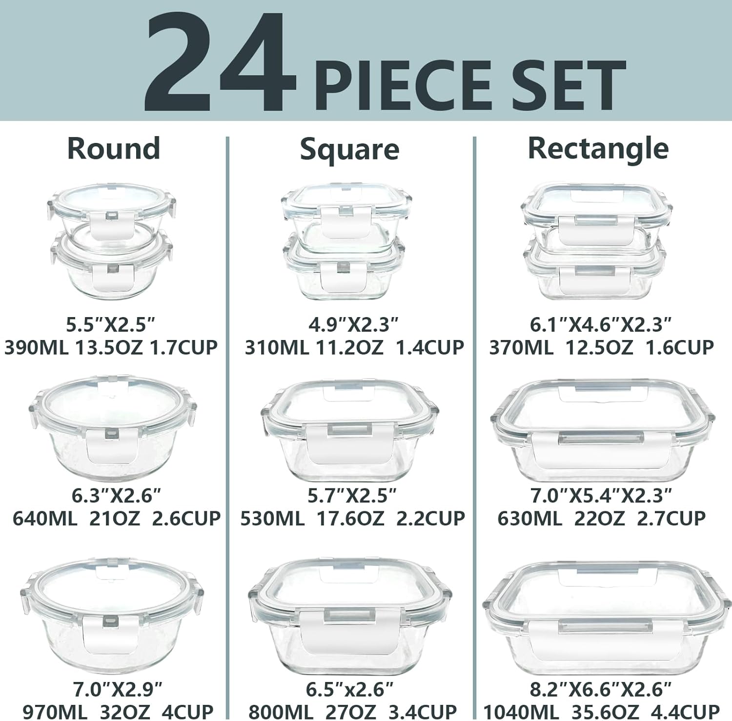 - 24 Pieces Glass Food Storage Ccontainers Set: This set includes 12 𝒑𝒊𝒆𝒄𝒆𝒔 𝒈𝒍𝒂𝒔𝒔 𝒄𝒐𝒏𝒕𝒂𝒊𝒏𝒆𝒓𝒔 𝒂𝒏𝒅 12 𝒑𝒊𝒆𝒄𝒆𝒔 𝒑𝒍𝒂𝒔𝒕𝒊𝒄 𝒍𝒊𝒅𝒔 with multiple sizes and shapes to fulfill your storage requirement, perfect for all your food storage needs. Package includes: Rectangular (1040ml,35.6 oz, 4.4cup/630ml, 22oz, 2.7cup/370ml, 12.5oz ,1.6cup), Square (800ml, 27oz, 3.4cup/530ml, 17.6oz, 2.2cup/310ml, 11.2oz, 1.4cup), and Round (970ml, 32oz, 4cup/640ml, 21 oz, 2.6cup/390ml, 13.5oz, 1.7cup).