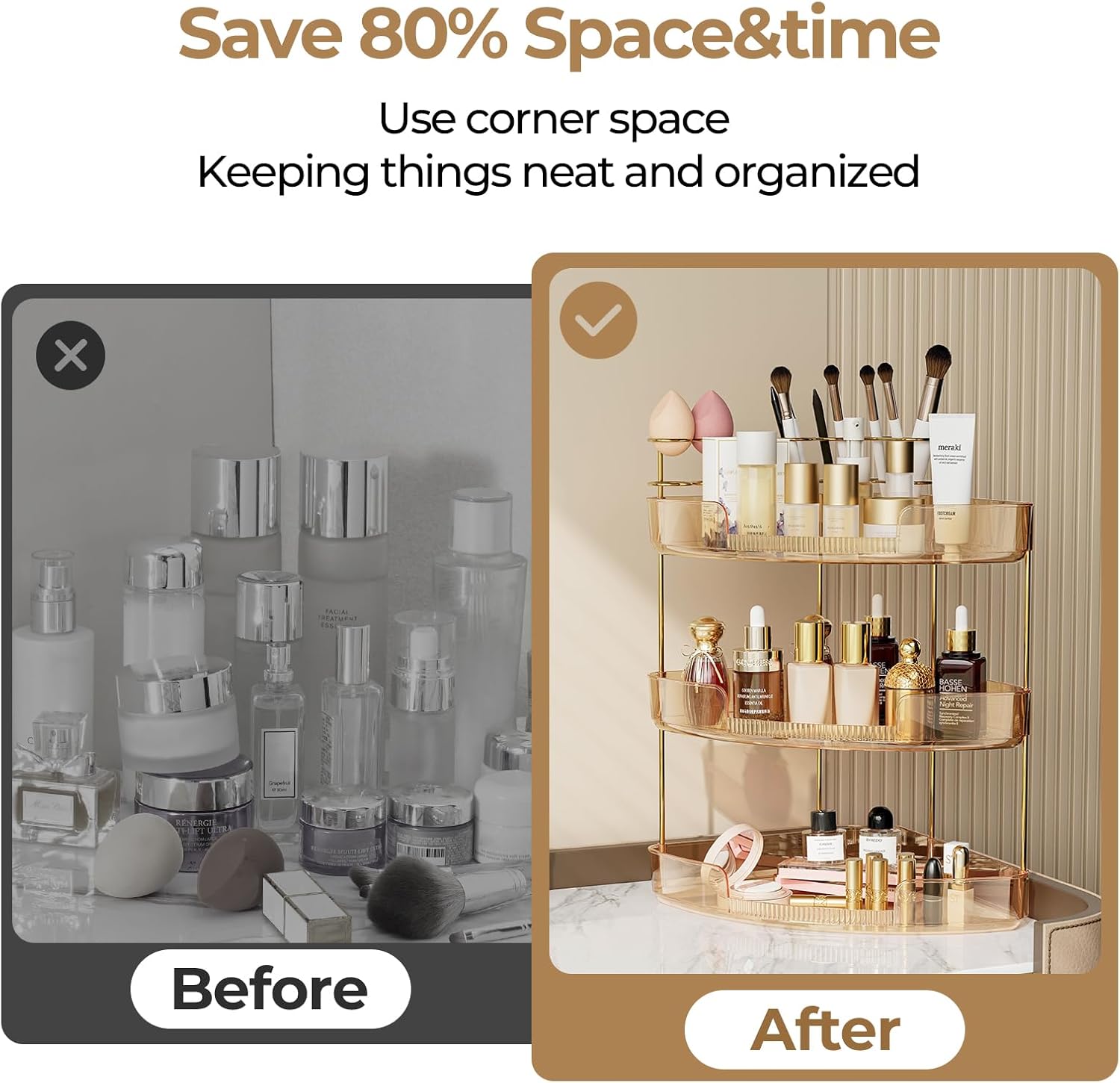 - Corner Makeup Organizer: Fully utilize your vanity countertop space with this innovative organizer, adding 100% extra storage while eliminating clutter; perfect makeup storage solution for a tidy bathroom or desk setup