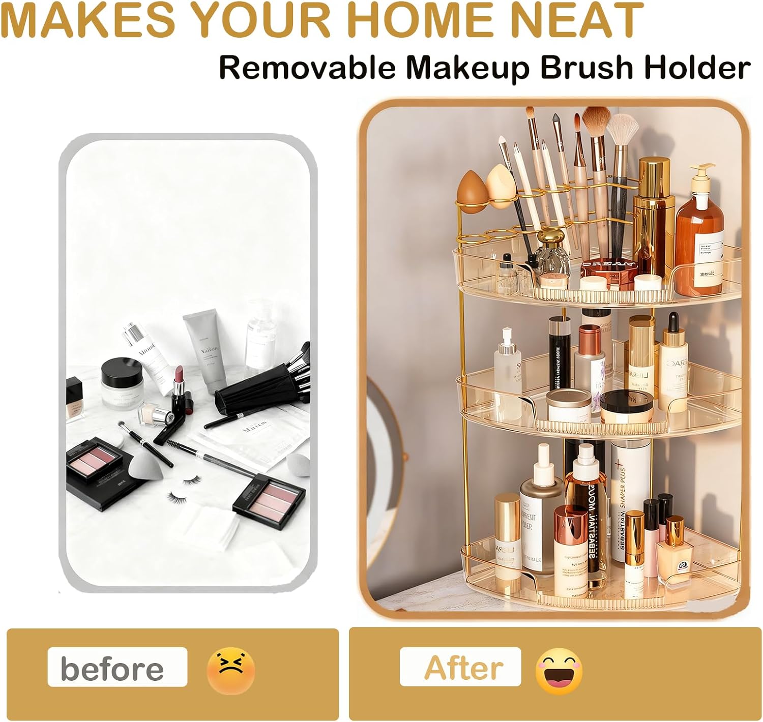 FELIZHOUSE 3-Tier Corner Bathroom Counter Organizer, Bathroom Countertop Shelf Makeup & Skincare Storage with Brush Holder for Vanity, Dresser, Kitchen - Amber