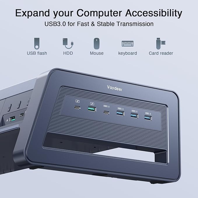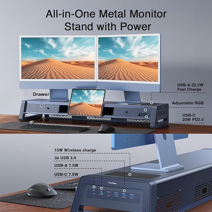 - 13-in-1 Dual Monitor Stand Riser: Vaydeer multifunctional stand featuring a dual monitor riser, wireless charging pad, 8 USB ports (4 fast charging, 4 data transfer), LED light strip, and storage drawers. Made from durable metal, it supports up to 50kg, helping you stay organized while reducing eye and neck strain for a more efficient workspace,1000mm (L) x 283mm (W) x 140mm (H).