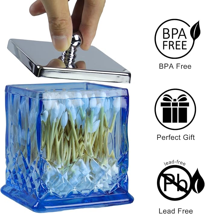 - Stylish & Simple: This blue jar is a simple and practical bathroom organizer. use it to store cotton balls, q-tips, and other small bathroom accessories. It helps keep your countertop tidy and your essentials within reach.