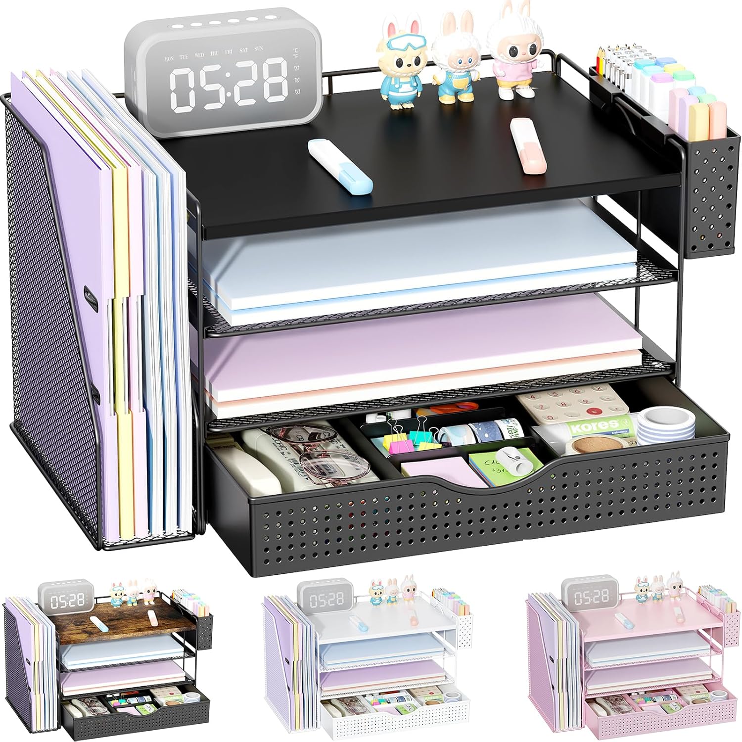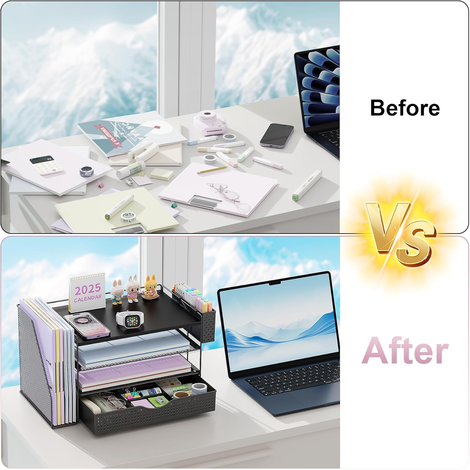 - 【Improve Work Efficiency】: This pen organizer contains 4 trays, 1 magazine rack, 1 pen holder, and 1 sliding drawer, which can help you quickly identify the contents of each compartment, helping to keep papers, notebooks, and office supplies neatly organized and easily accessible., so that you can stay busy and creative all day long.