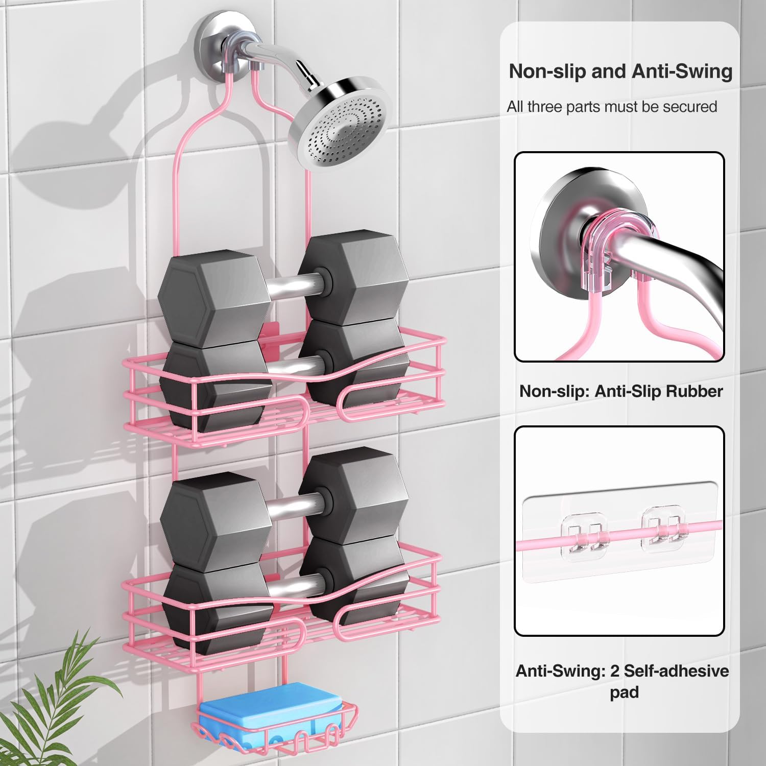 Over the Shower Head Caddy Pink - Shower Caddy Hanging with 3 Soap Holders, Stainless Steel Bathroom Organizer and Storage, Rustproof