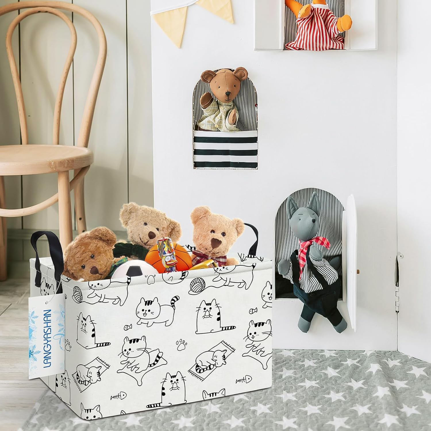 LANGYASHAN Rectangular Storage Bin Collapse Canvas Fabric Cartoon Storage Basket with Handles for Organizing Home Kitchen Boys and Girls Toys Office Closet Shelf Baskets (Rec Cat)