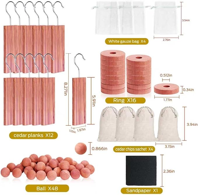 - Multi purpose - Our cedar blocks set includes 12 hanging boards, 16 cedar rings, 48 cedar balls, 4 packs of cedar sachets, one piece of frosted paper, and two yarn bags. You can DIY cedar sachets, such as putting balls into yarn bags, hanging them in cars, etc. By combining different shapes of cedar wood, it is convenient for you to use it for different purposes.