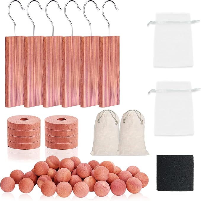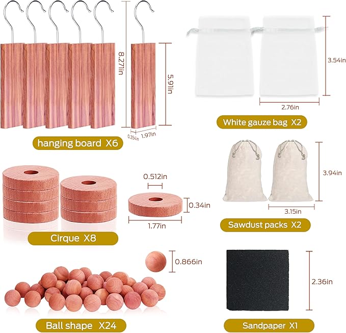 - Multi purpose - Our cedar blocks set includes 6 hanging boards, 8 cedar rings, 24 cedar balls, 2 packs of cedar sachets, one piece of frosted paper, and two yarn bags. You can DIY cedar sachets, such as putting balls into yarn bags, hanging them in cars, etc. By combining different shapes of cedar wood, it is convenient for you to use it for different purposes.