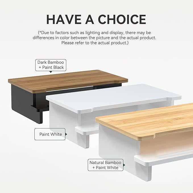 - 【Built to Last with Premium Materials】 Crafted from natural bamboo and high-density MDF panel, this monitor riser offers a sleek, modern look while supporting up to 110 lbs—ideal for monitors, all-in-one PCs, or heavy displays