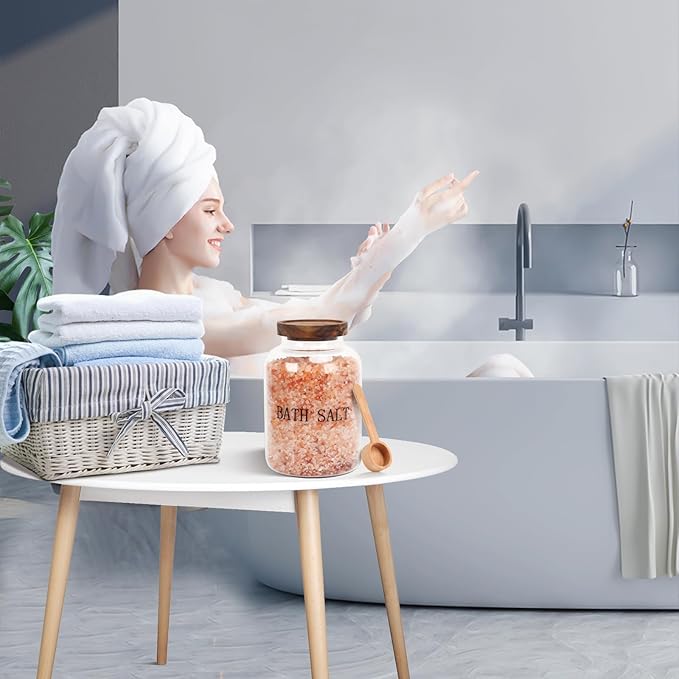 - Stylish and Simple Style:Our glass storage containers with lids and scoop make it convenient for you to dispense the exact amount of your bath salts,This thick glass jar container with a lid is not going to break or crack easily.while the wooden scoop adds a rustic decoration to your bathroom storage items.