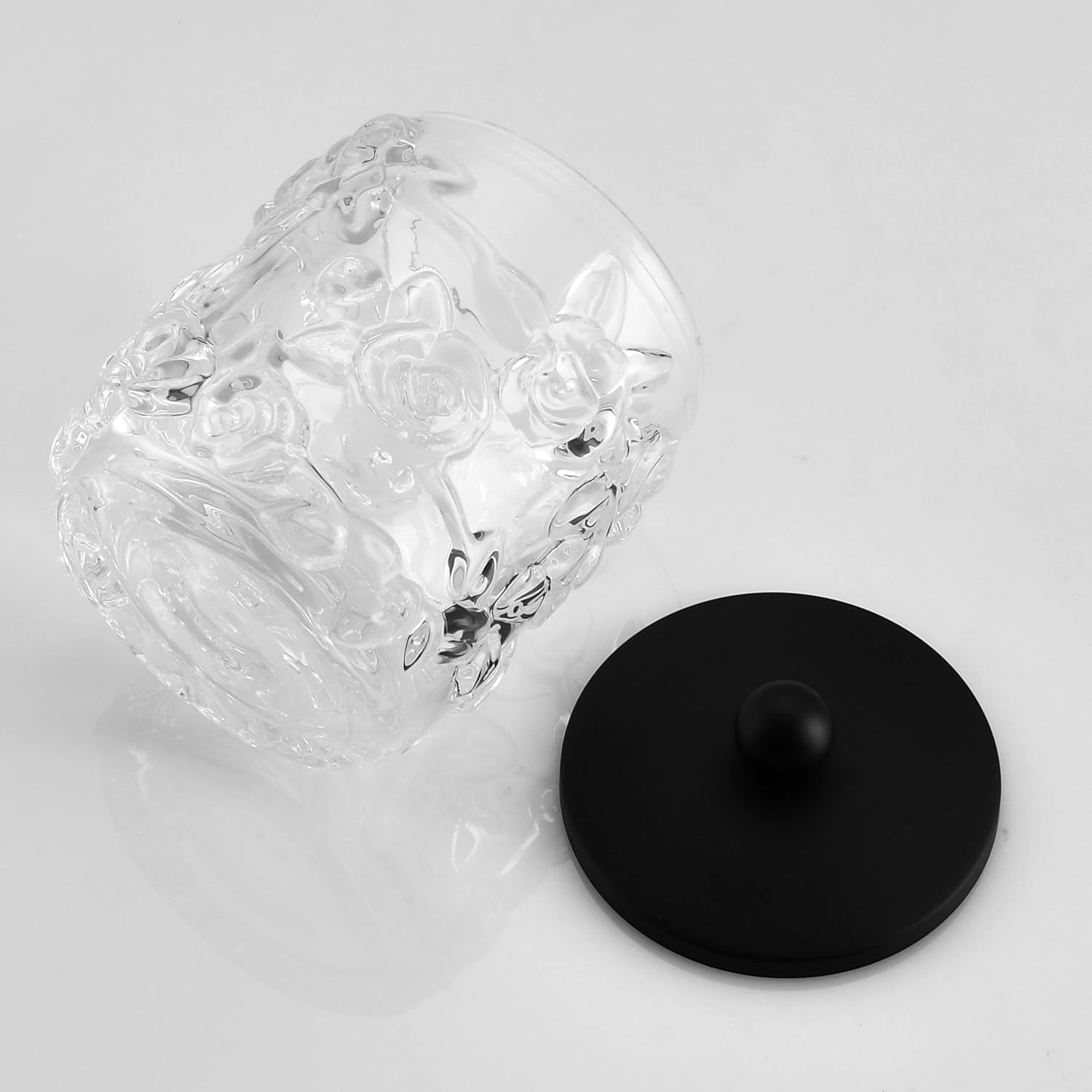 Clear Transparent Apothecary Floral Embossed Glass Jar With Matte Black Metal Lid Cover for Bathroom Organization, Cotton Balls, Q Tips, and Small Accessories, Bathroom Storage