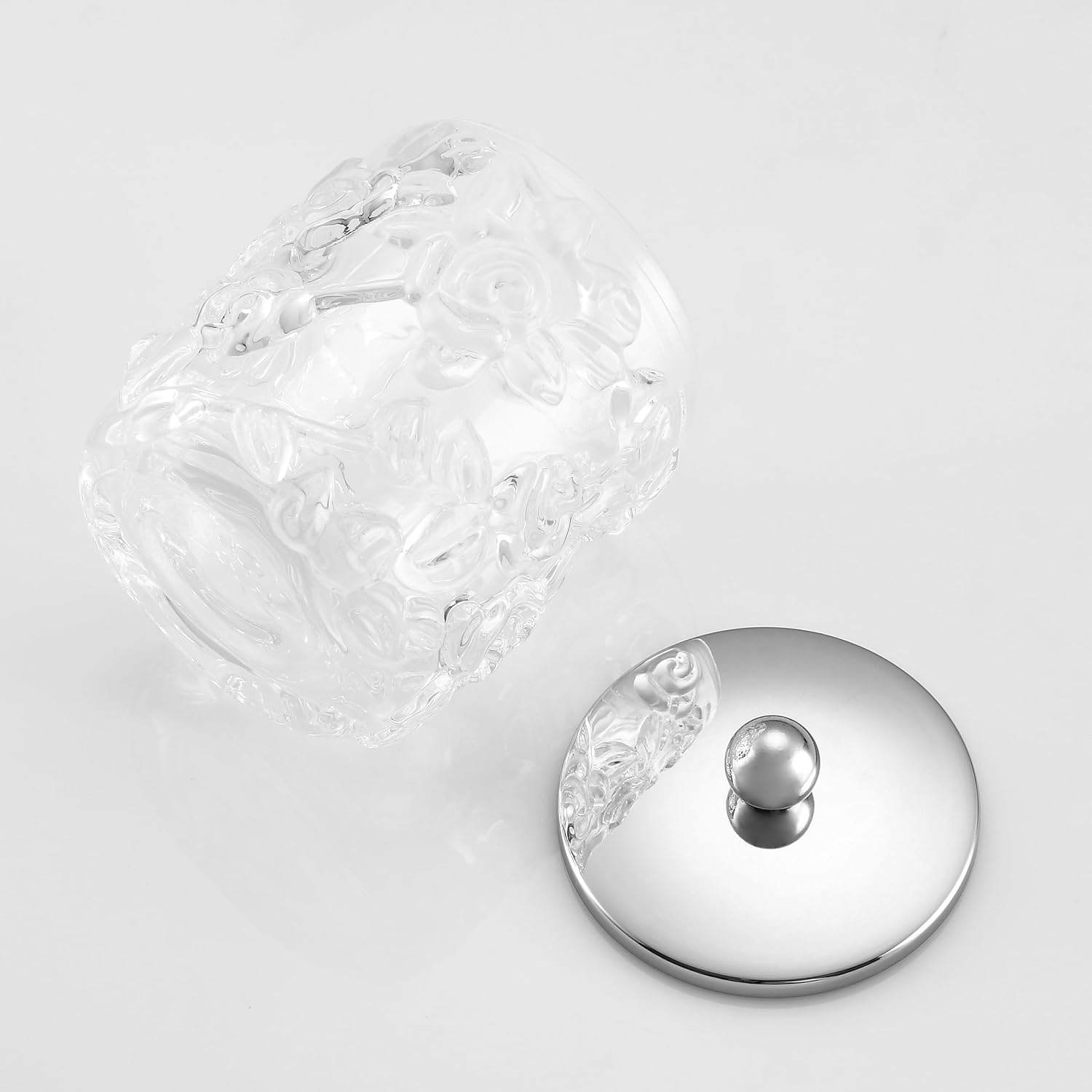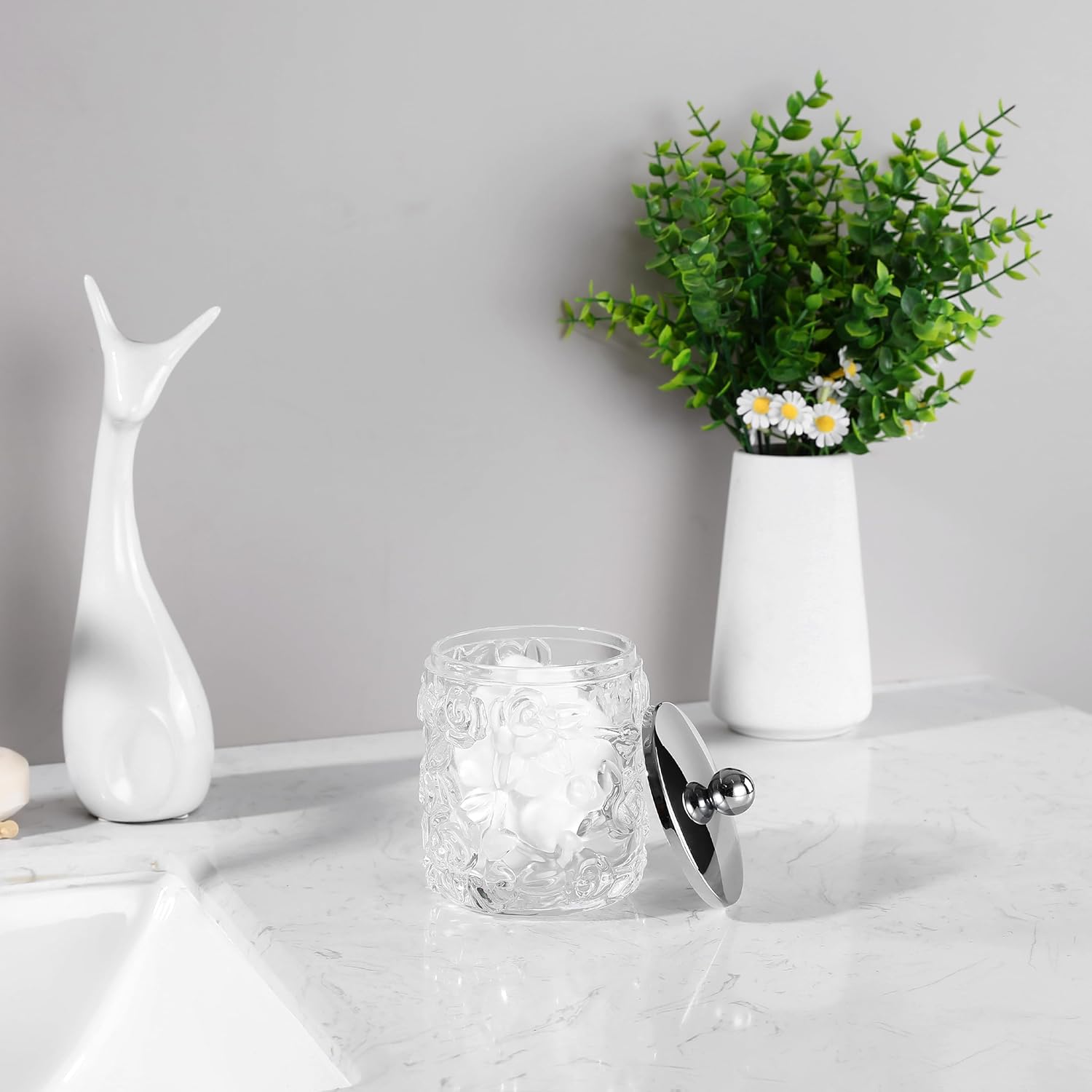 - 🧴 Practicality & Everyday Use: Designed with both beauty and function in mind, this glass jar offers an elegant storage solution for everyday bathroom essentials. Keeps your countertop tidy and clutter-free, while displaying items in a visually appealing way. The jar is the perfect size for storing cotton balls, cotton swabs, or makeup rounds, keeping them clean, dry, and easily accessible. The transparent glass makes it easy to see when supplies are running low, ensuring you’re always stocked. The embossed floral glass and Silver/Chrome lid bring a touch of luxury to everyday storage, transforming a simple utility item into a decorative accent.