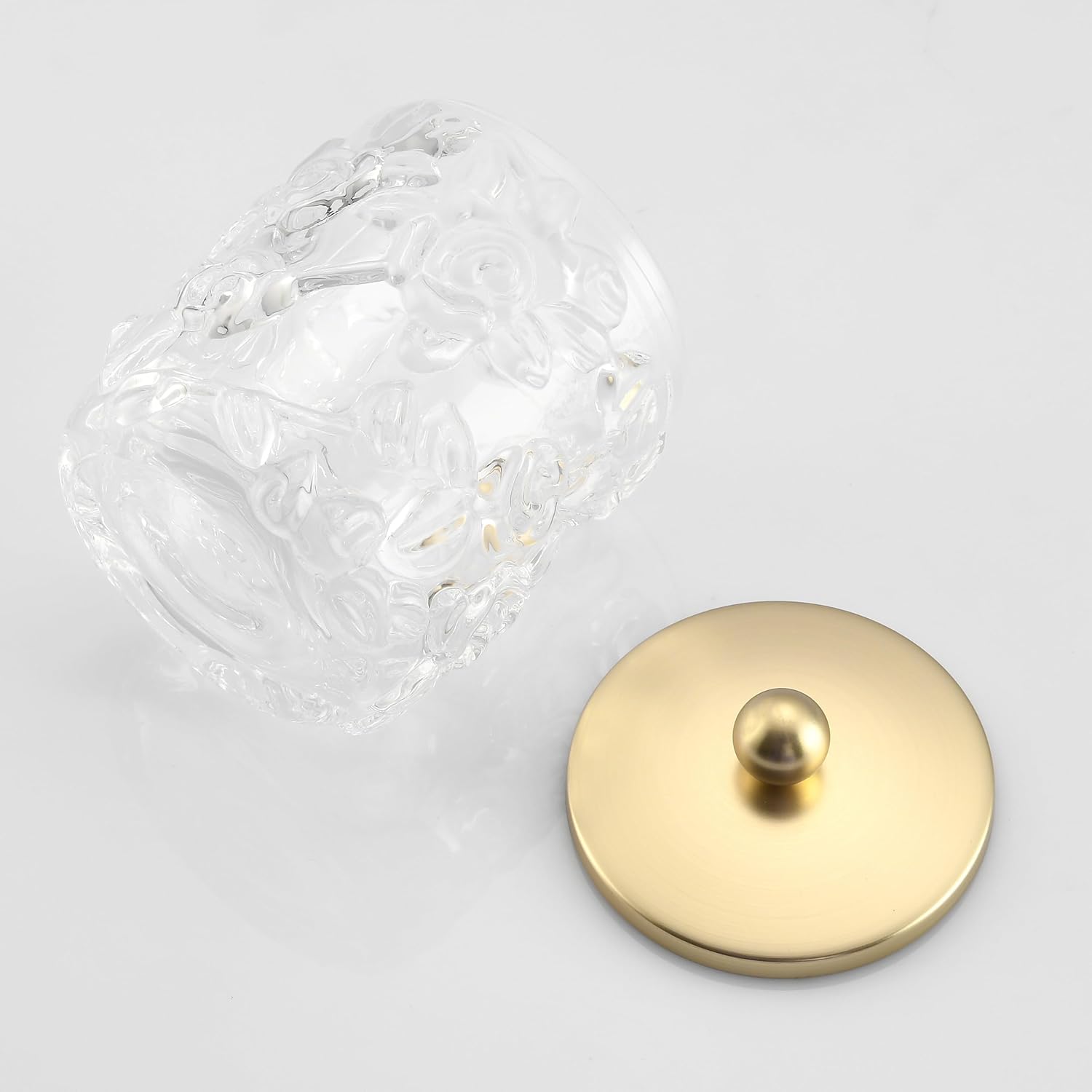- 🧴 Practicality & Everyday Use: Designed with both beauty and function in mind, this glass jar offers an elegant storage solution for everyday bathroom essentials. Keeps your countertop tidy and clutter-free, while displaying items in a visually appealing way. The jar is the perfect size for storing cotton balls, cotton swabs, or makeup rounds, keeping them clean, dry, and easily accessible. The transparent glass makes it easy to see when supplies are running low, ensuring you’re always stocked. The embossed floral glass and gold lid bring a touch of luxury to everyday storage, transforming a simple utility item into a decorative accent.