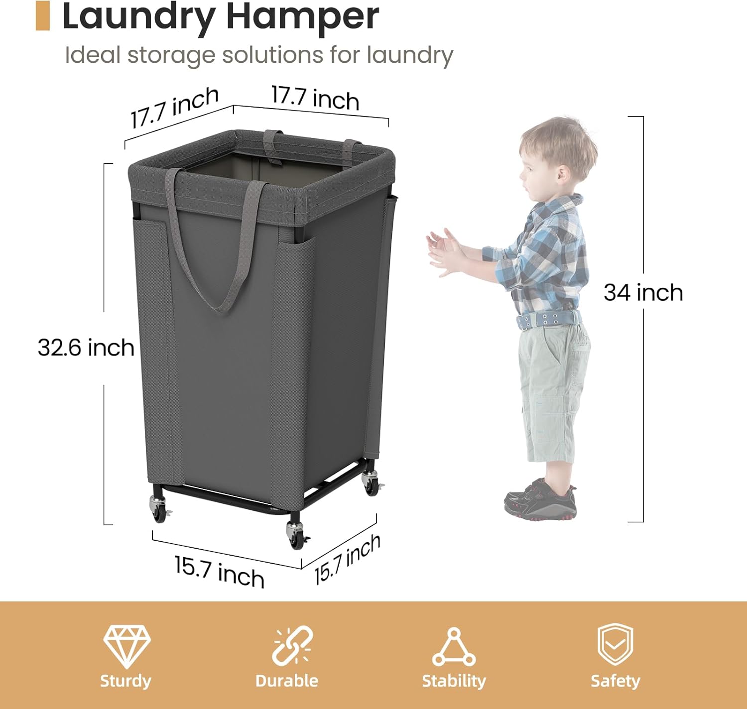 - Large Capacity: Boasting a spacious 160L capacity and dimensions of 17.7" L x 17.7" W x 32.6" H (wheels included), this laundry hamper offers ample storage for dirty clothes, bed sheets, towels, pillows, toys, and more—eliminating the need for multiple trips when transporting your items