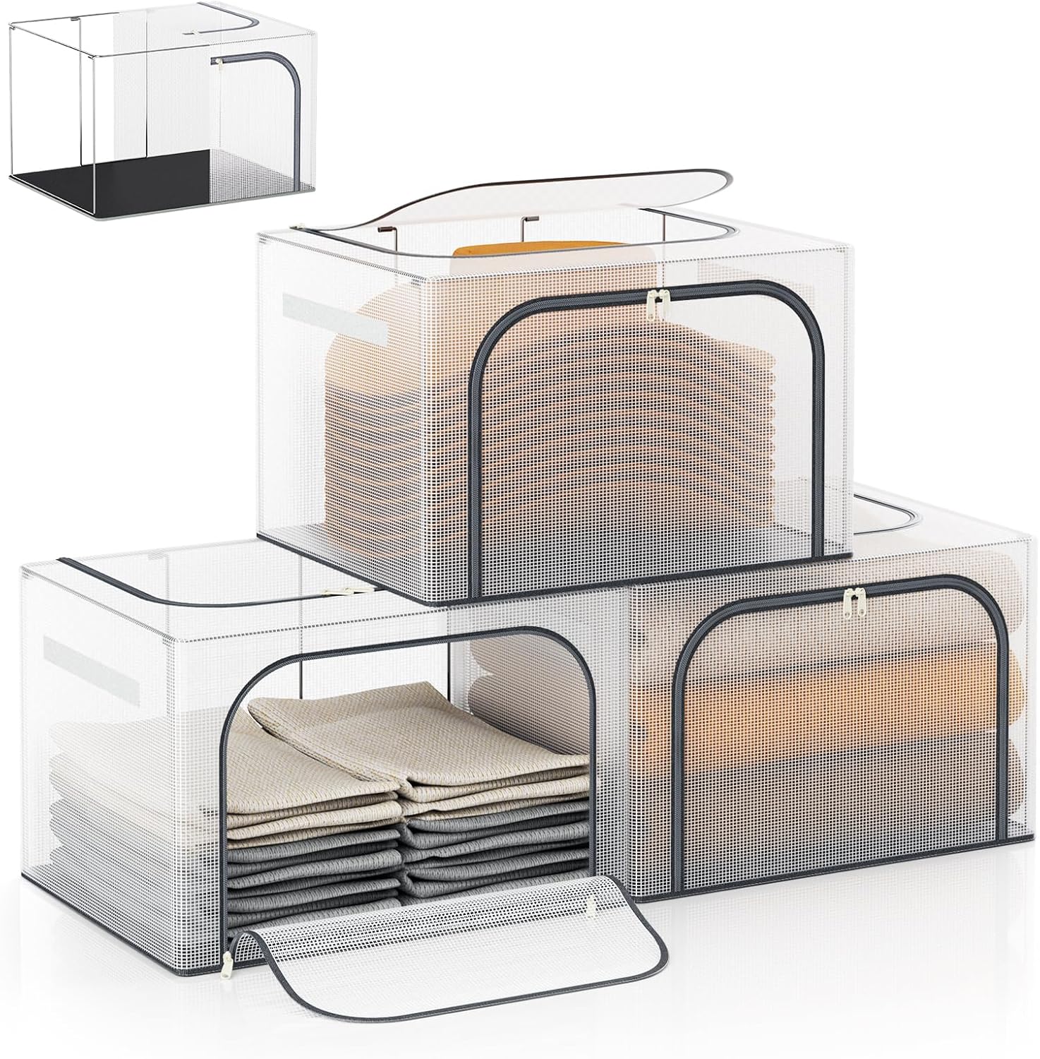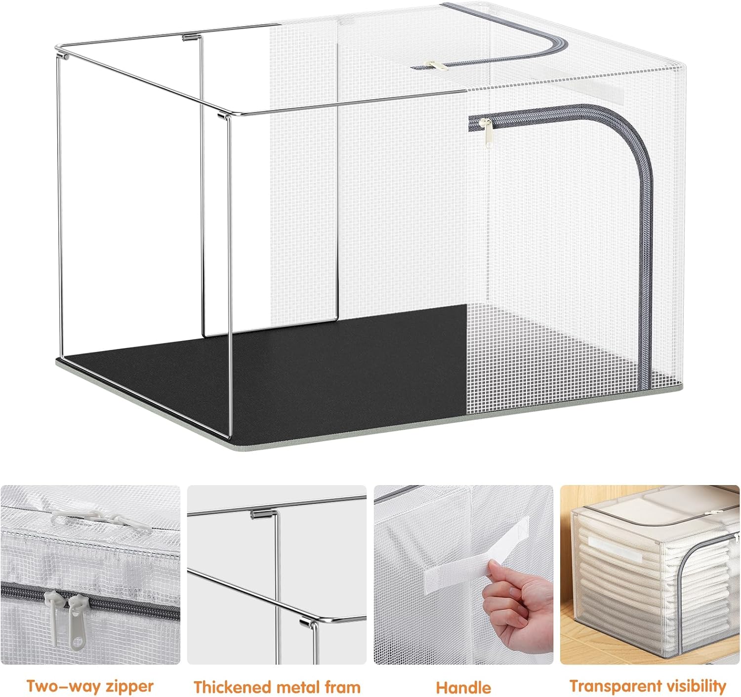 Large size 66L Fully Transparent Openings Clothes Storage Bins with Metal Frame, Stackable & Foldable Storage Box with Lids, Closet Organizers, Cap, Sweater.(19.7x 15.75 x 13 Inches)