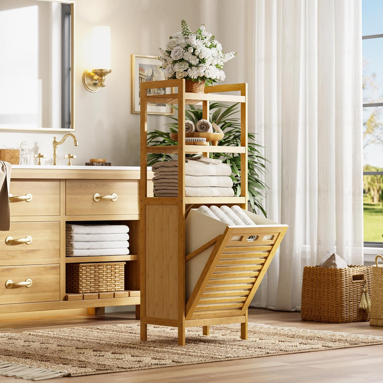 HITNET Tilt Out Laundry Hamper, Bamboo Laundry Basket with Foldable Bag and 3 Open Shelves, Freestanding Clothes Storage Organizer for Bedroom, Bathroom, Living Room, Natural