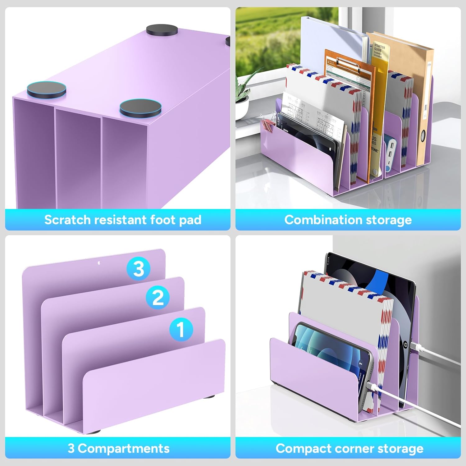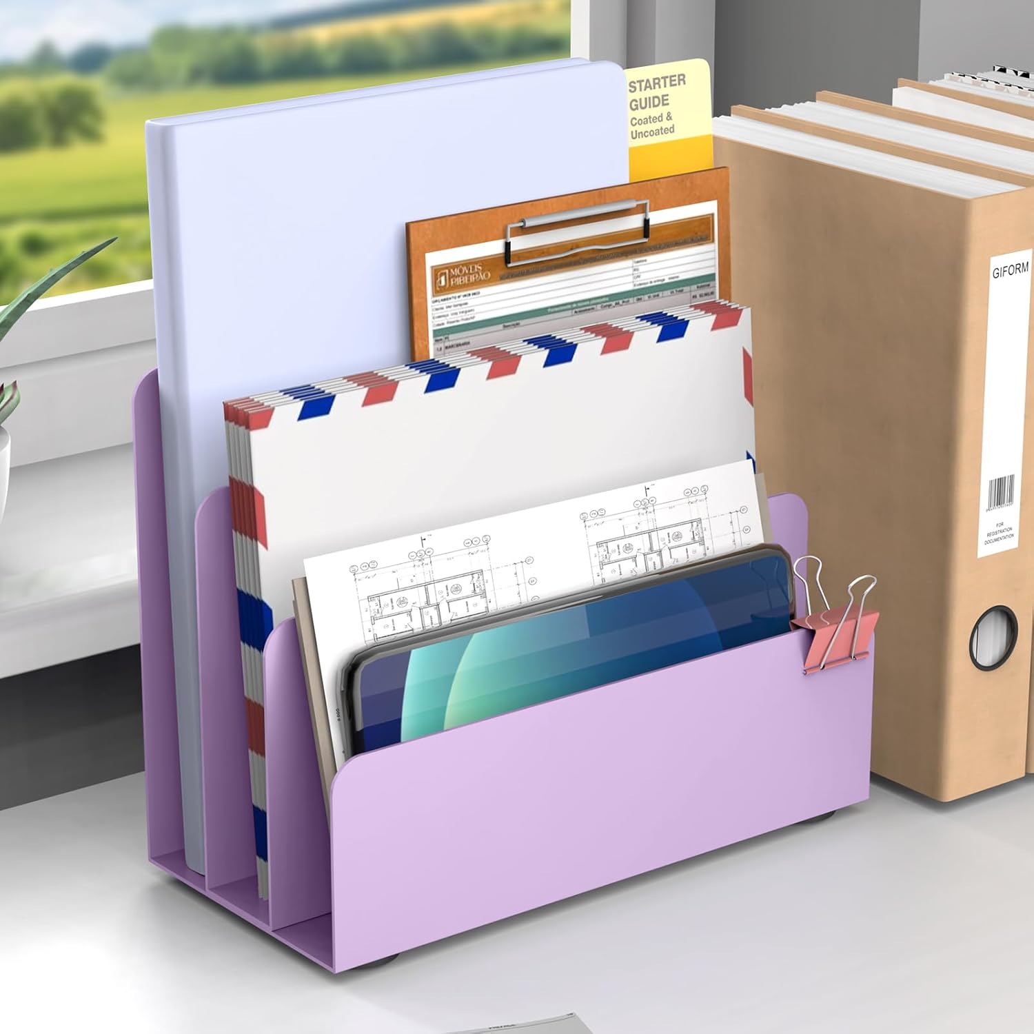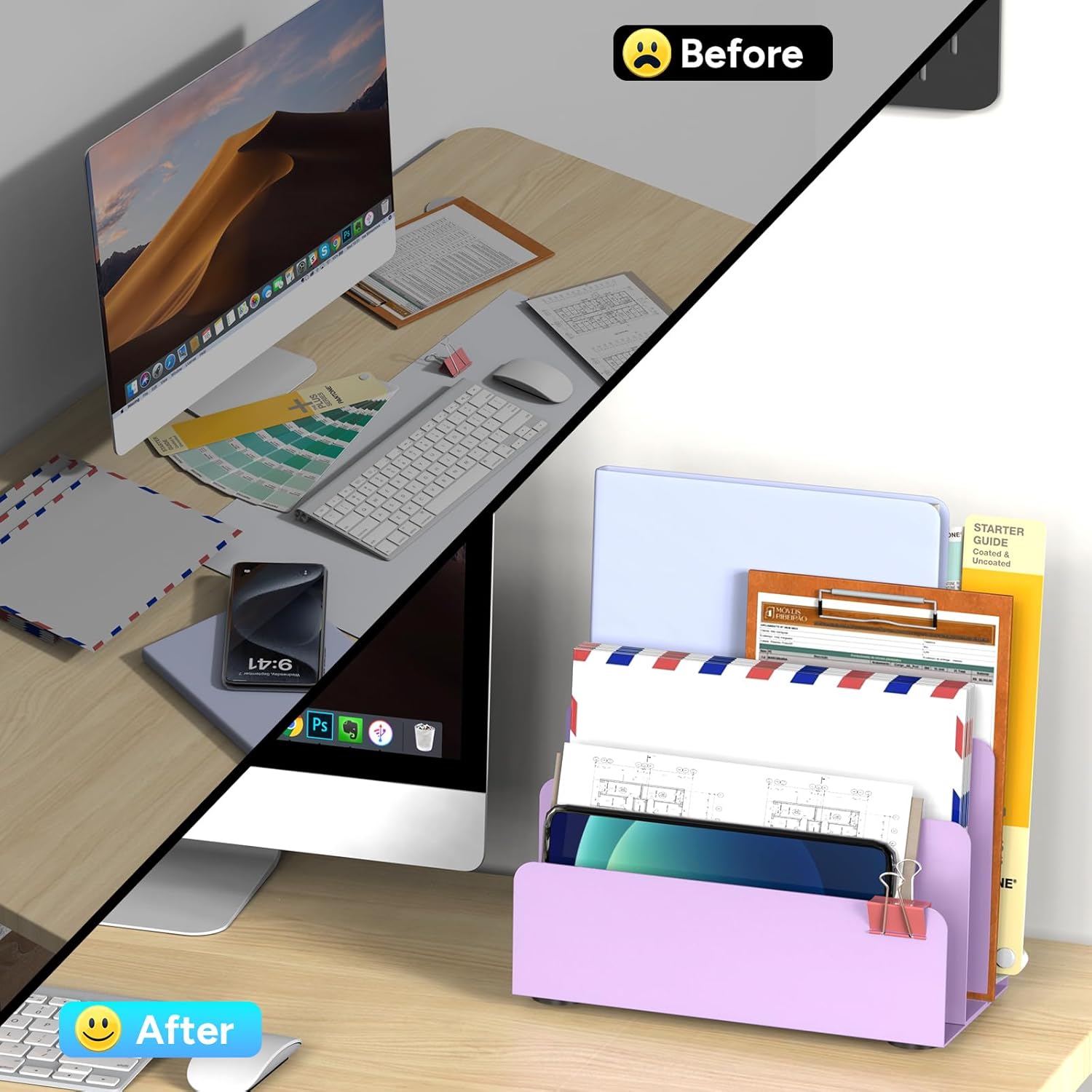 Mail Organizer Countertop, Small Desk File Organizer, Metal File Holder - Essential Workspace Organizers for Office Desk, Home Office (Purple)
