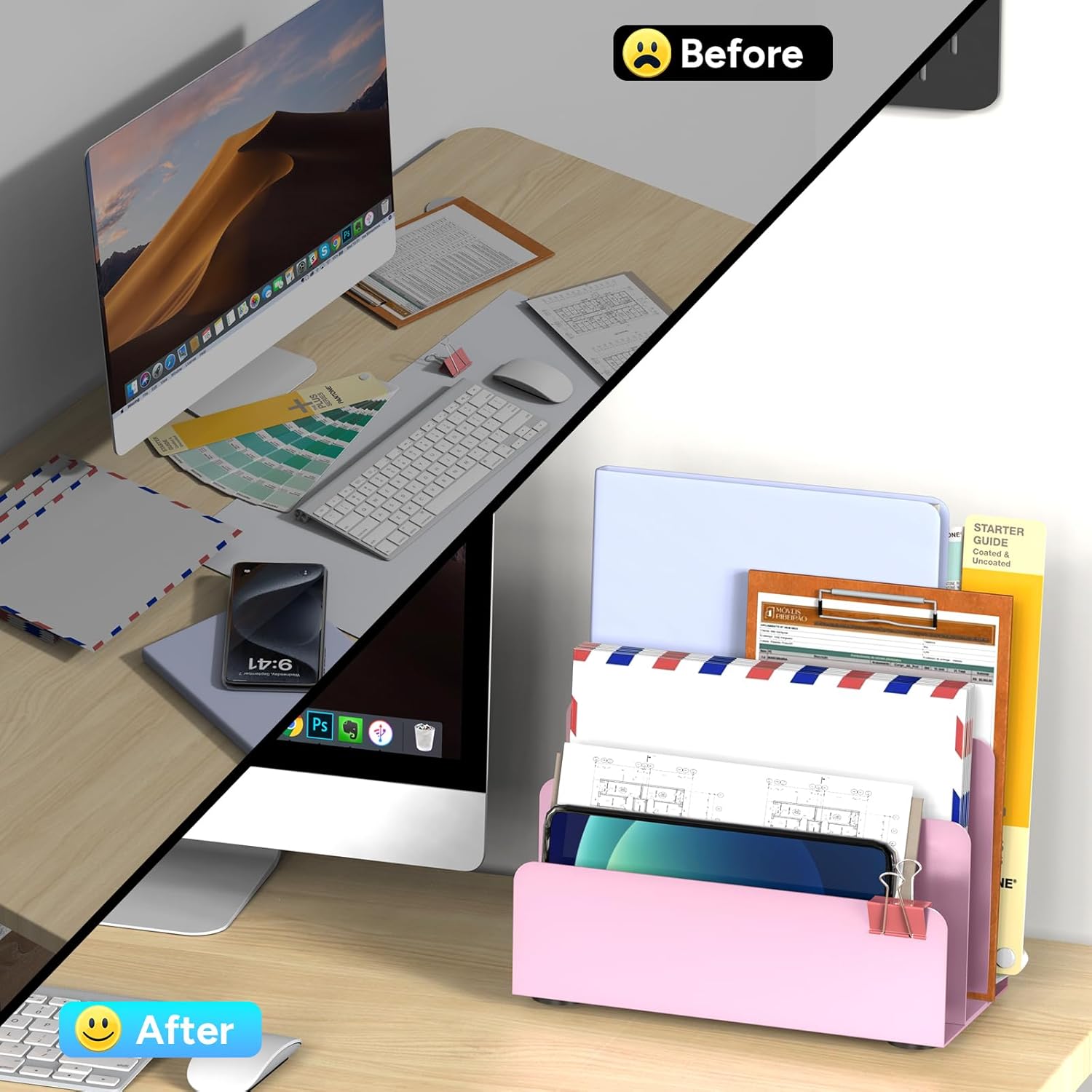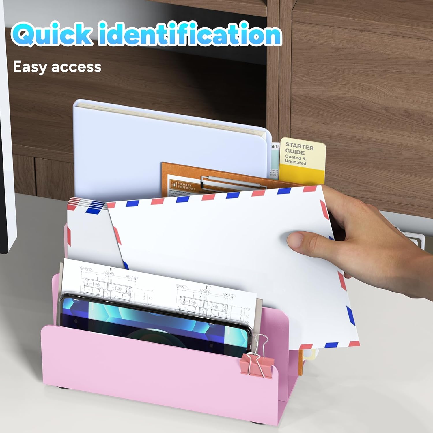 Mail Organizer Countertop, Small Desk File Organizer, Metal File Holder - Essential Workspace Organizers for Office Desk, Home Office (Pink)