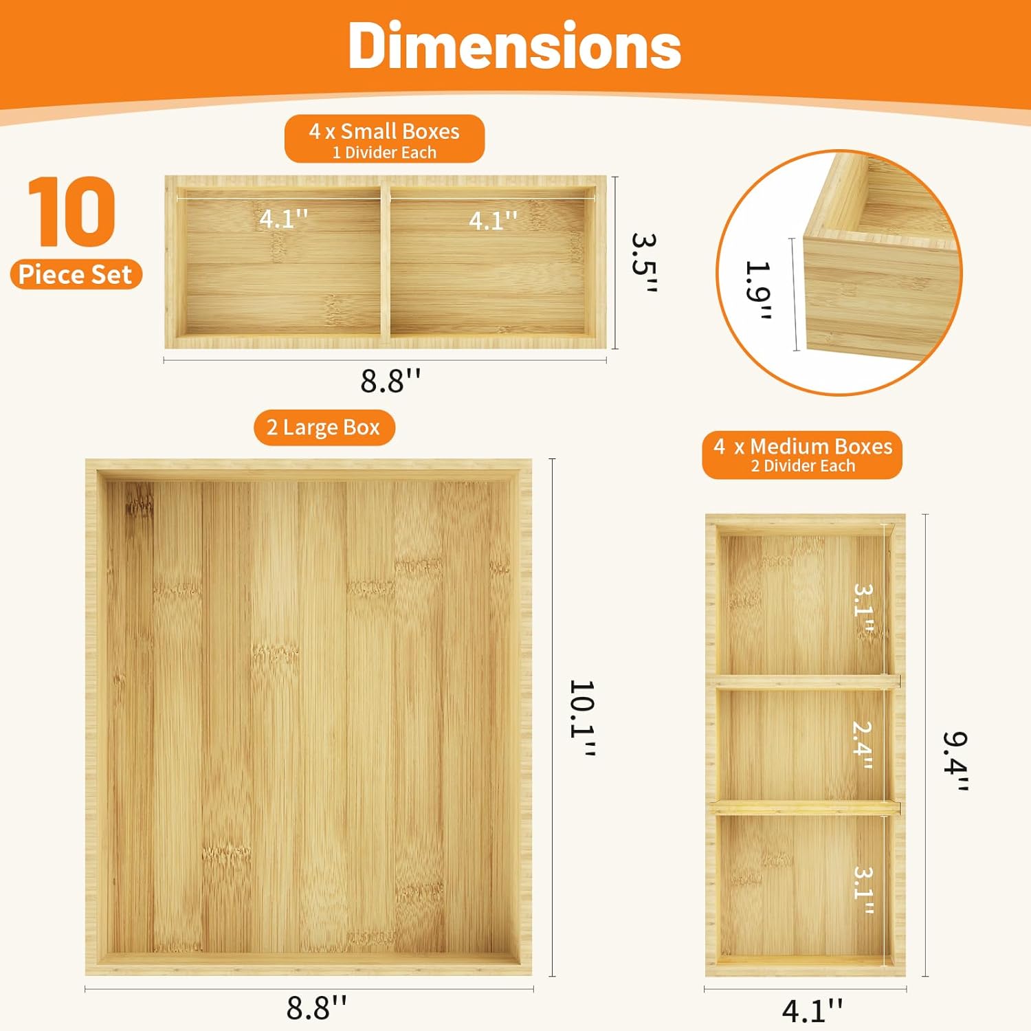 SpaceWhisper Bamboo Drawer Organizer, 10-Piece Drawer Divider with Removable Dividers for Organization and Storage, Multi-Use Stackable Storage Box & Utensil Holder for Kitchen, Office, Makeup & More