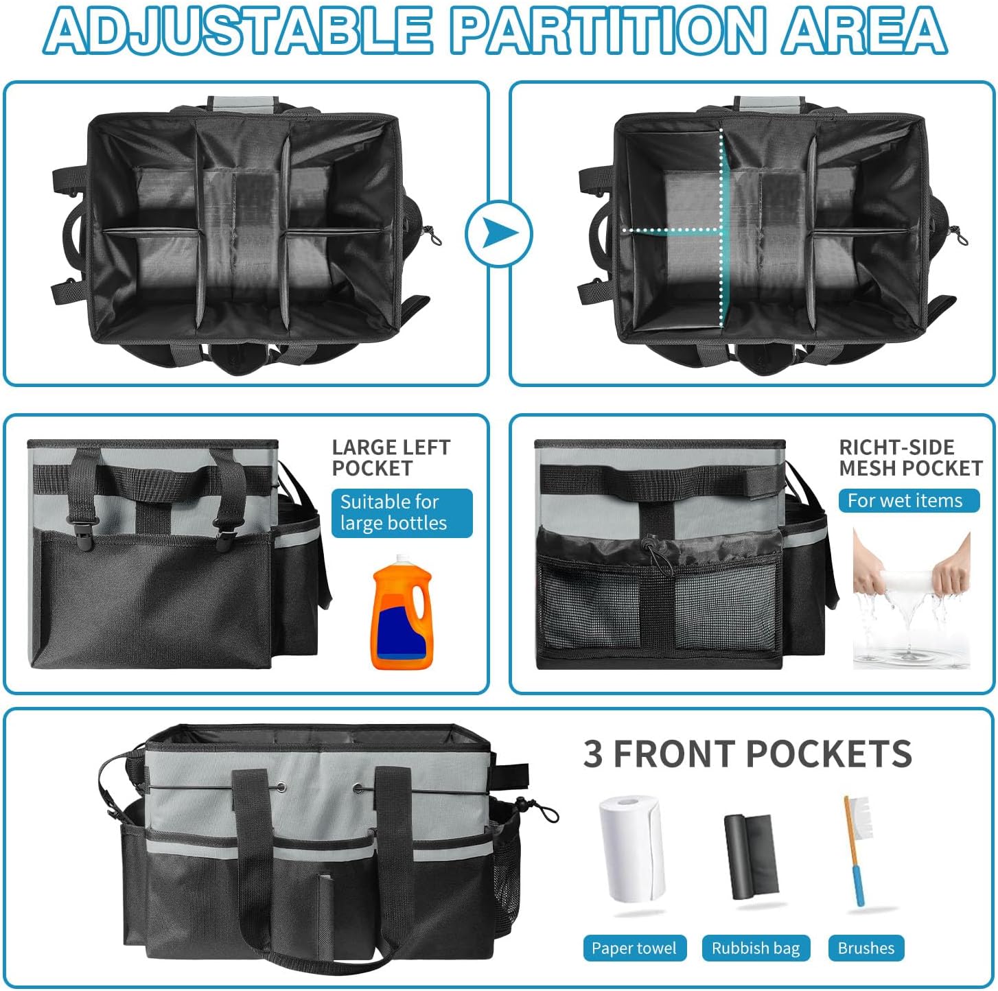 Organizer with Handles for Cleaning Tools, 17.8*12.2*9.3in Large Cleaning Caddy Bag Waterproof Car Cleaning Tool Organizer Bag with Shoulder Detachable Divider for Cleaners Housekeeper(Grey)