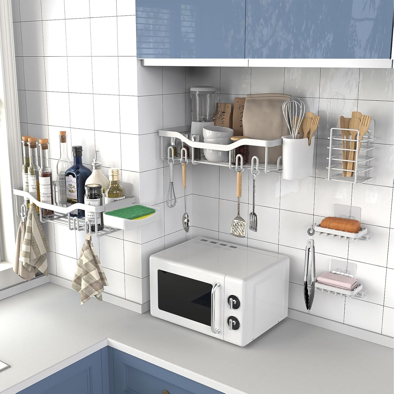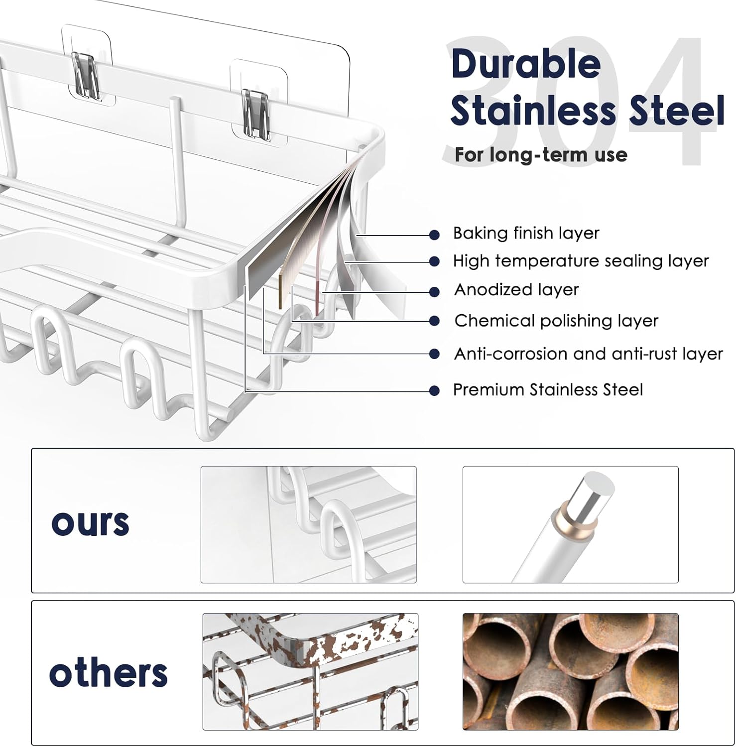 Shower Caddy Adhesive Shower Organizer 7-Pack, Rustproof Stainless Steel Bathroom Shelves, Large Capacity No-Drill Rack Storage Accessories with Soap Dish Toothbrush Holder Hooks (White)