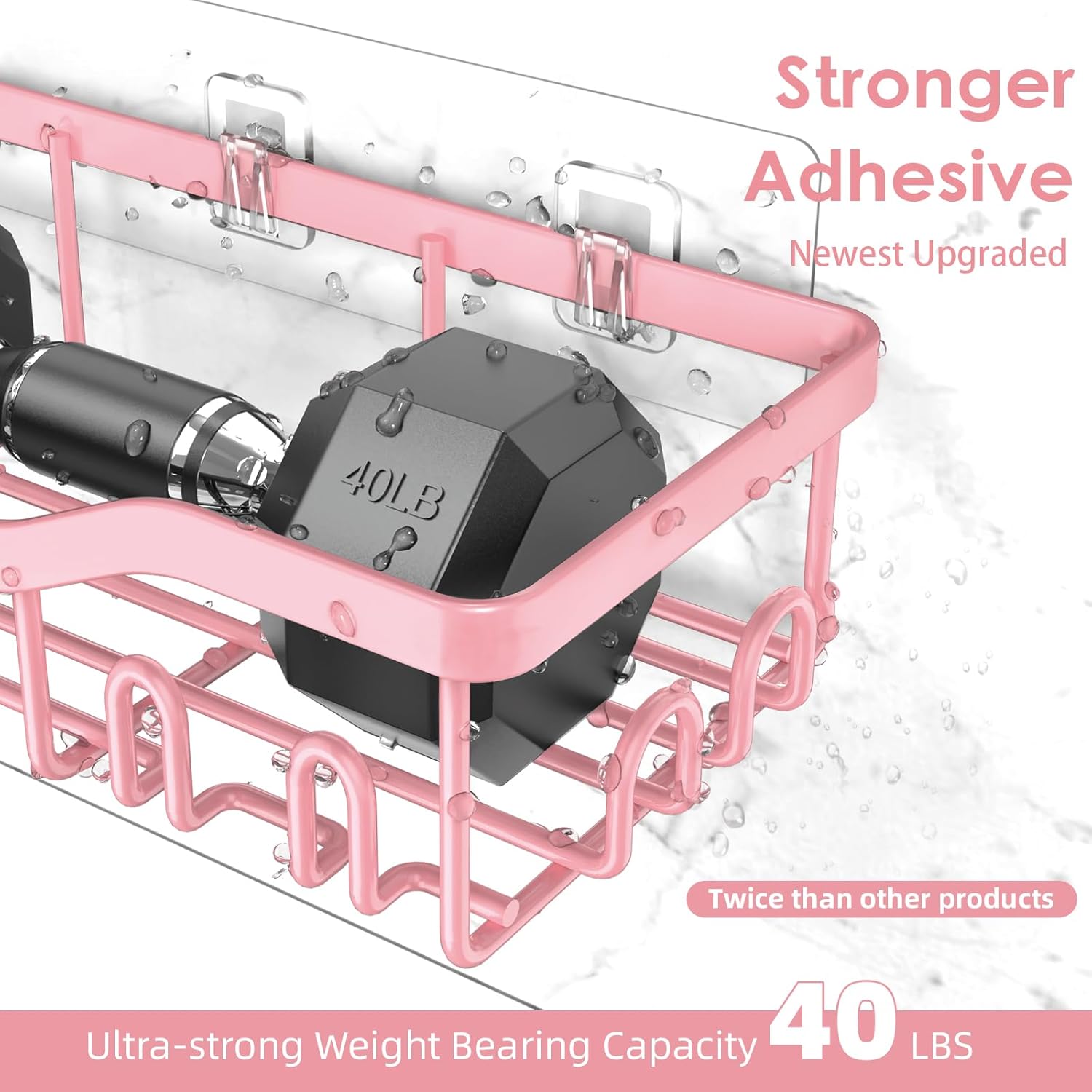Shower Caddy Adhesive Shower Organizer 7-Pack, Rustproof Stainless Steel Bathroom Shelves, Large Capacity No-Drill Rack Storage Accessories with Soap Dish Toothbrush Holder Hooks (Pink)