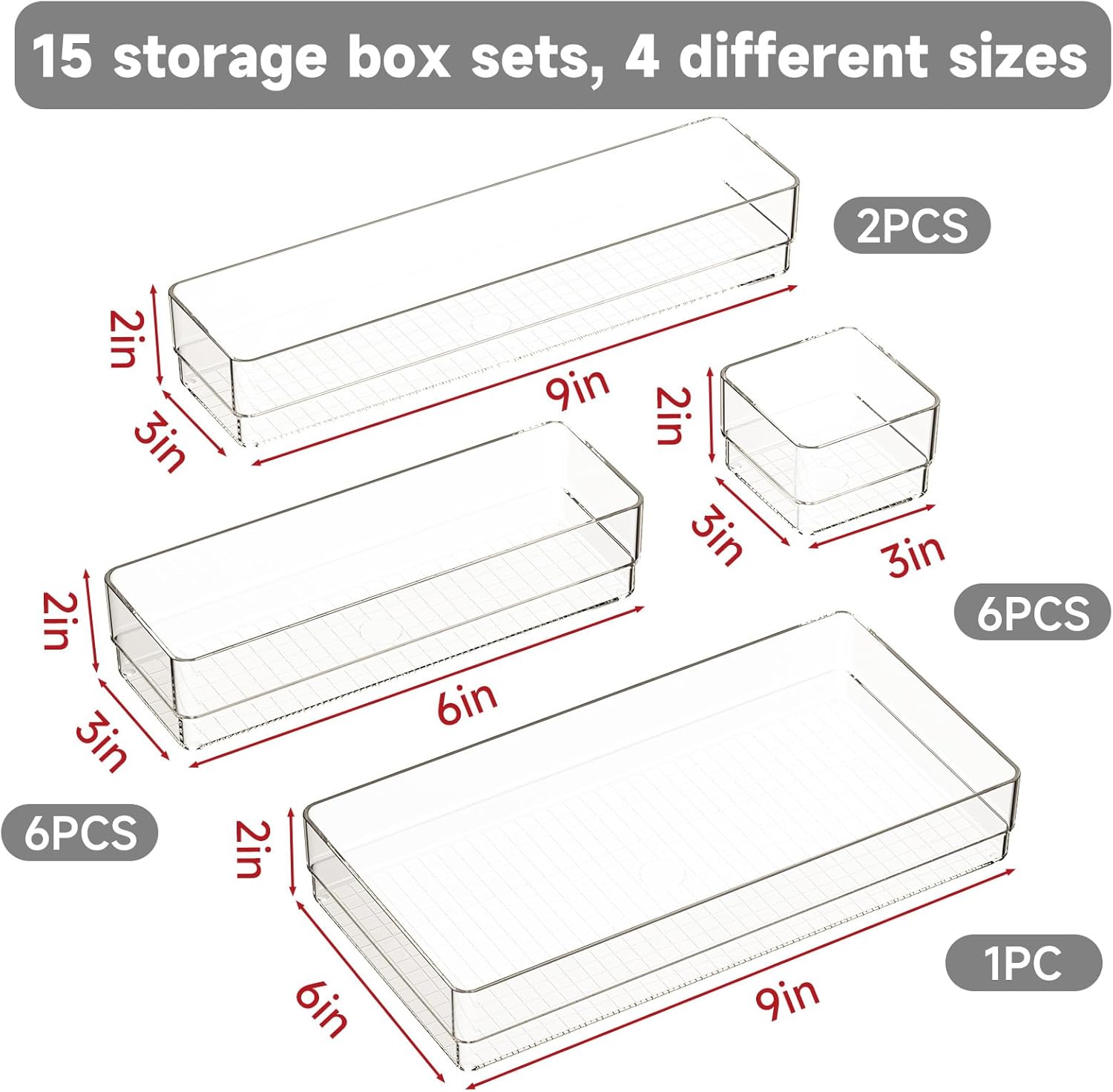 - Product Specifications:This set includes 15 storage boxes in 4 different sizes. Includes: 9 x 6 x 2 inches (1pcs), 9 x 3 x 2 inches(2pcs), 6 x 3 x 2 inches(6pcs), 3 x 3 x 2 inches(6pcs).