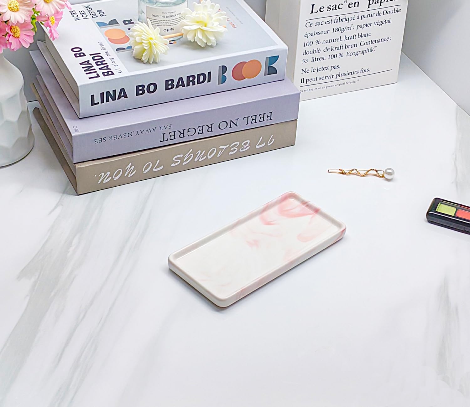 - Elegant Pink Porcelain Tray - This delicate ceramic tray in soft pink adds a touch of charm to any space. Perfect as a vanity tray for organizing perfumes and jewelry or as a bathroom counter tray for soaps and essentials. Its compact size (6.4"L x 3"W) fits neatly on dressers, nightstands, or kitchen counters.