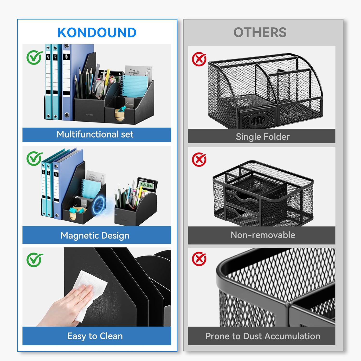 - 【EASILY OPTIMIZE YOUR SPACE 】KONDOUND office desk accessories can hold pens, glasses, scissors, glue sticks, business cards, sticky notes, paper clips, erasers, and other office supplies, providing ample storage space. The file folder storage rack can hold books, notebooks, and other items. With this set of desktop accessories, your workspace will be neat and attractive.