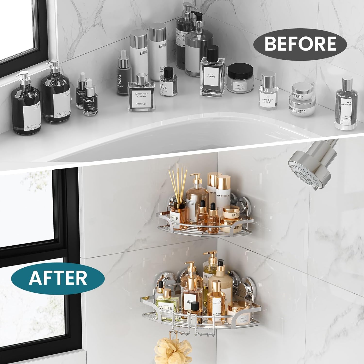 - Multipurpose 2-piece set: This shower caddy with suction cups perfects for Bathroom & Kitchen Storage, such as hand sanitizer, disinfectant cleaner, shampoo, conditioner, shower gel, facial cleanser, kitchen tools, etc., anywhere you needed to tidy up storage. Corner basket shelf set contains 2 hooks, which can storage bath shower loofahs, shower brushes and other bath products