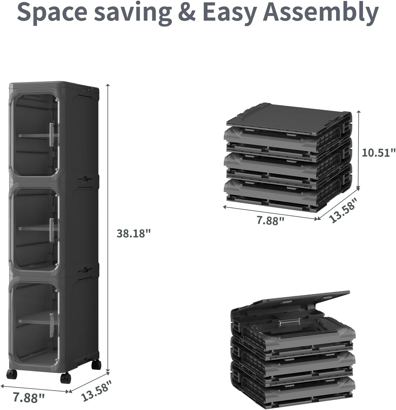 KHNR 3-Tiers Slim Bathroom Storage Cabinet, Foldable Storage Cabinets,Narrow Bathroom Storage,Movable Bathroom Storage Organizer for Small Spaces,Bathroom,Kitchen,Laundry,Black