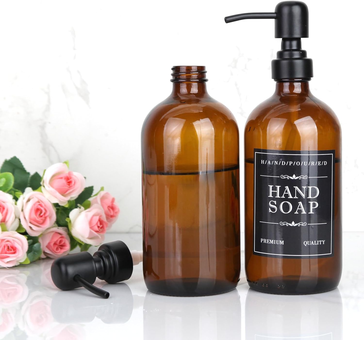 2 Pack Brown Glass Bottle, Soap Dispenser with Stainless Steel Pump,17 oz Upgrade Hand and Dish Soap Dispensers Kitchen, Hand Soap Dispenser Bathroom Accessories for Hotel, Vacation Rental, Restaurant
