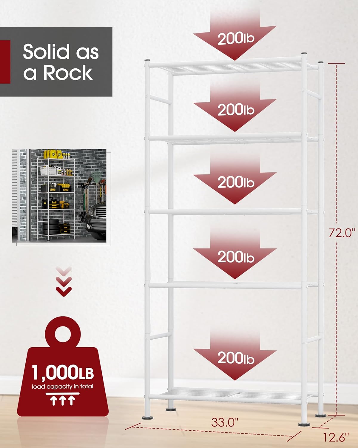 Storage Shelves - 5 Tier Shelf Organizer, Heavy Duty Garage Shelving Unit with Leveling Feet, Stable Metal Shelves Organizer for Pantry, Kitchen and Closet, 33.0" W x 12.6" D x 72.0" H, White