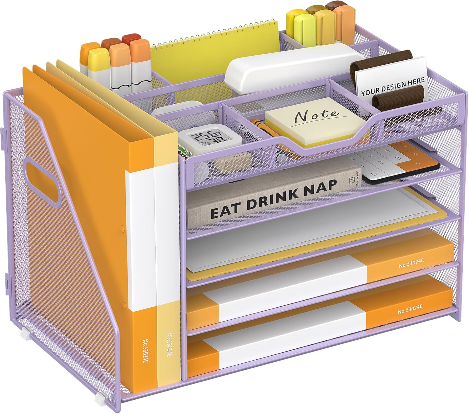 5 Tier Paper Letter Tray with File Holder and 3 Drop-in Pen Holders, Mesh Desk File Organizer with Handle, Desk Organizers and Accessories for School,Home, Office Supplies Storage-Purple