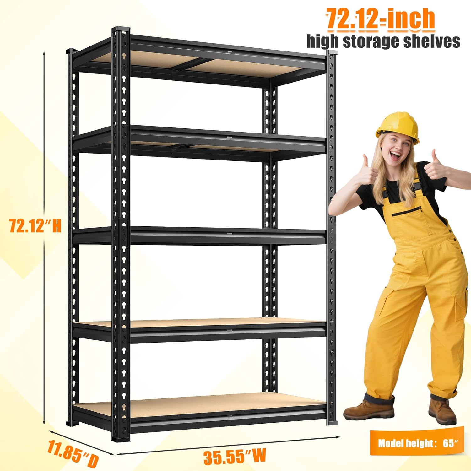 72.12" H Garage Shelving, Storage Shelves Load 2100LBS, 5-Tier Adjustable Shelving Unit with Thickened Wooden Boards for Multiple Scenarios, 72.12" H x 35.55" W x 11.85" D, Black, 4 Pack