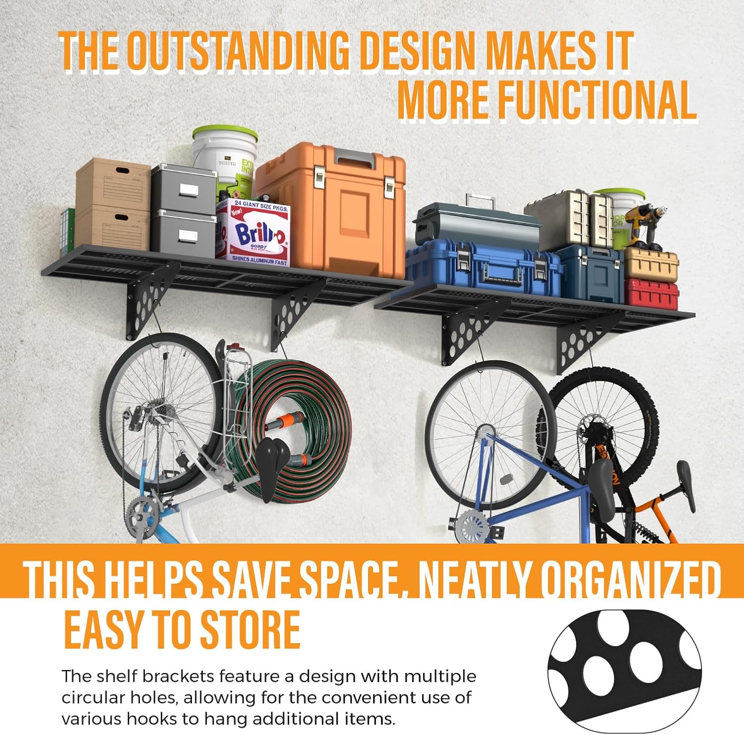 - SAVE SPACE IN THE HOME LOGISTICS: The wall mount rack can help your garage floor clean and tidy, make your garage less crowded, this garage wall shelf also comes with multiple metal hooks, can help you save a lot of space in the garage.