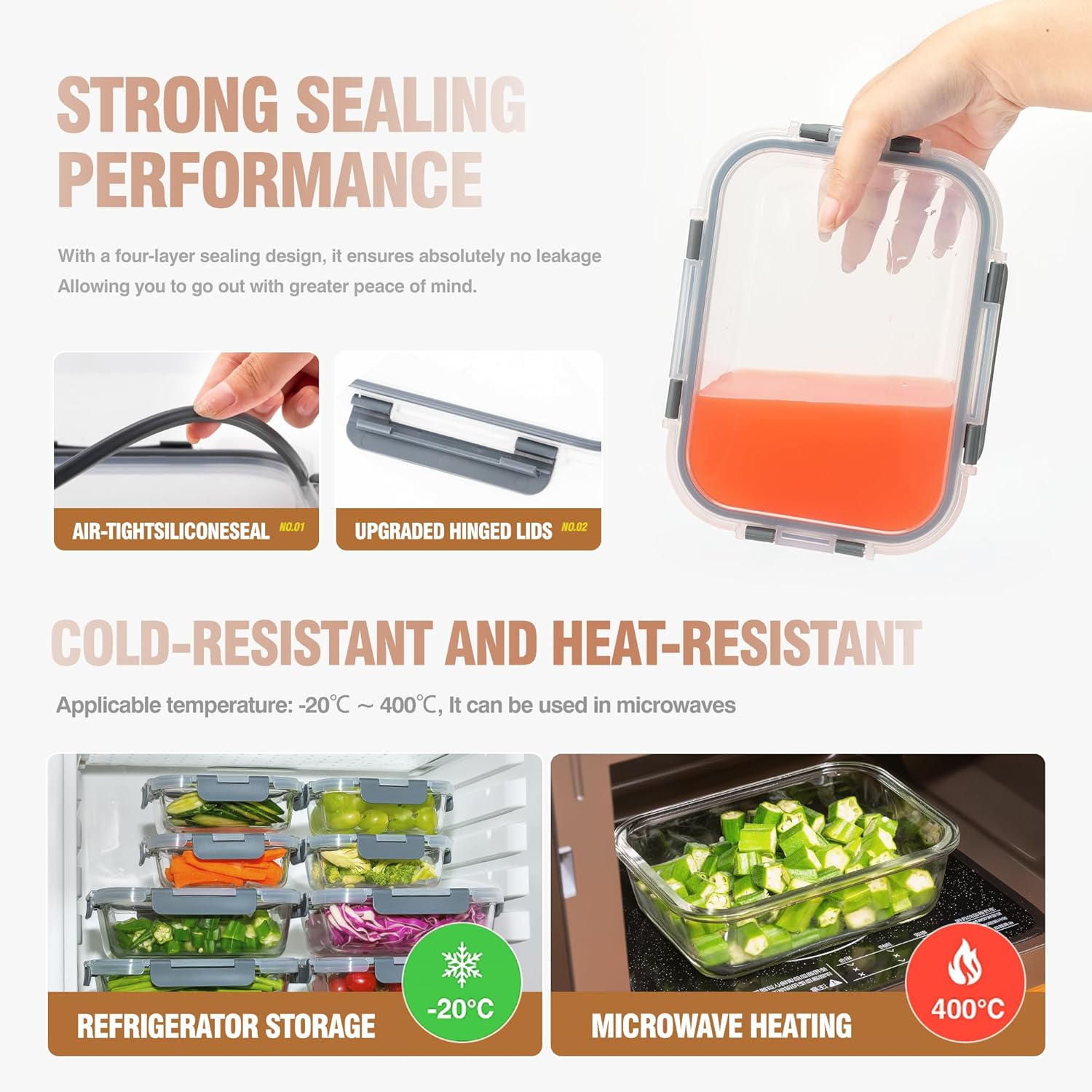 - ✅AIRTIGHT SMART LOCKING LIDS: Glass food storage containers use snap lock lids that comes with silicone seals to make your meal prep food will last much longer than normal plastic food storage containers. These lids are easy to use and will stop leaking. These lids will not break or slowly stop working