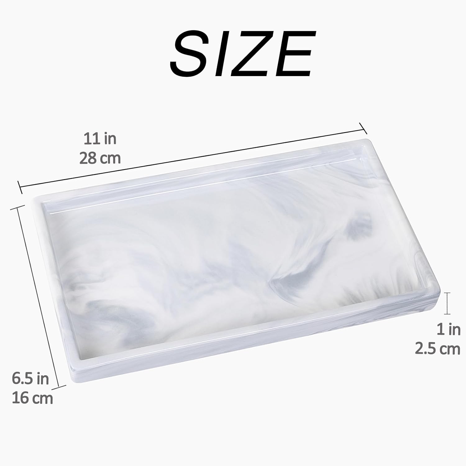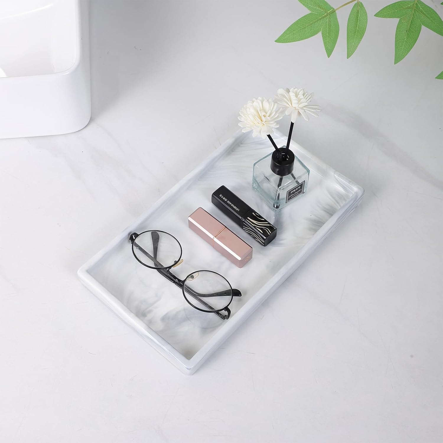 Bathroom Vanity Tray - 11'' Ceramic Rectangle Countertop Tray, Heavy-Duty Perfume Organizer Plate, Jewelry Ring Tray, Kitchen Soap Dispenser Stone Trays, Marble White