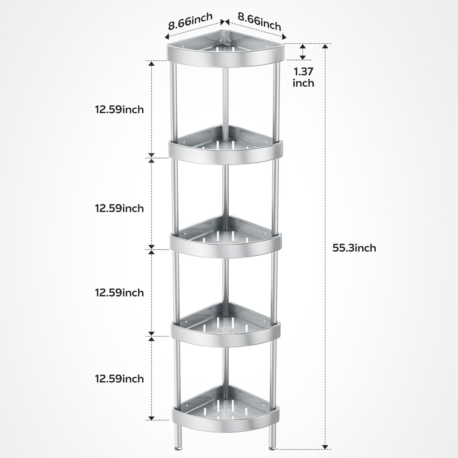 Nieifi Corner Shower Caddy Stand-5 Tier Rustproof Anodized Aluminum Standing Shower Organizer-Shower Caddy Corner-Dual Stability to Anti-Shaking-Height-Adjustable Legs for Uneven Surfaces-Silver