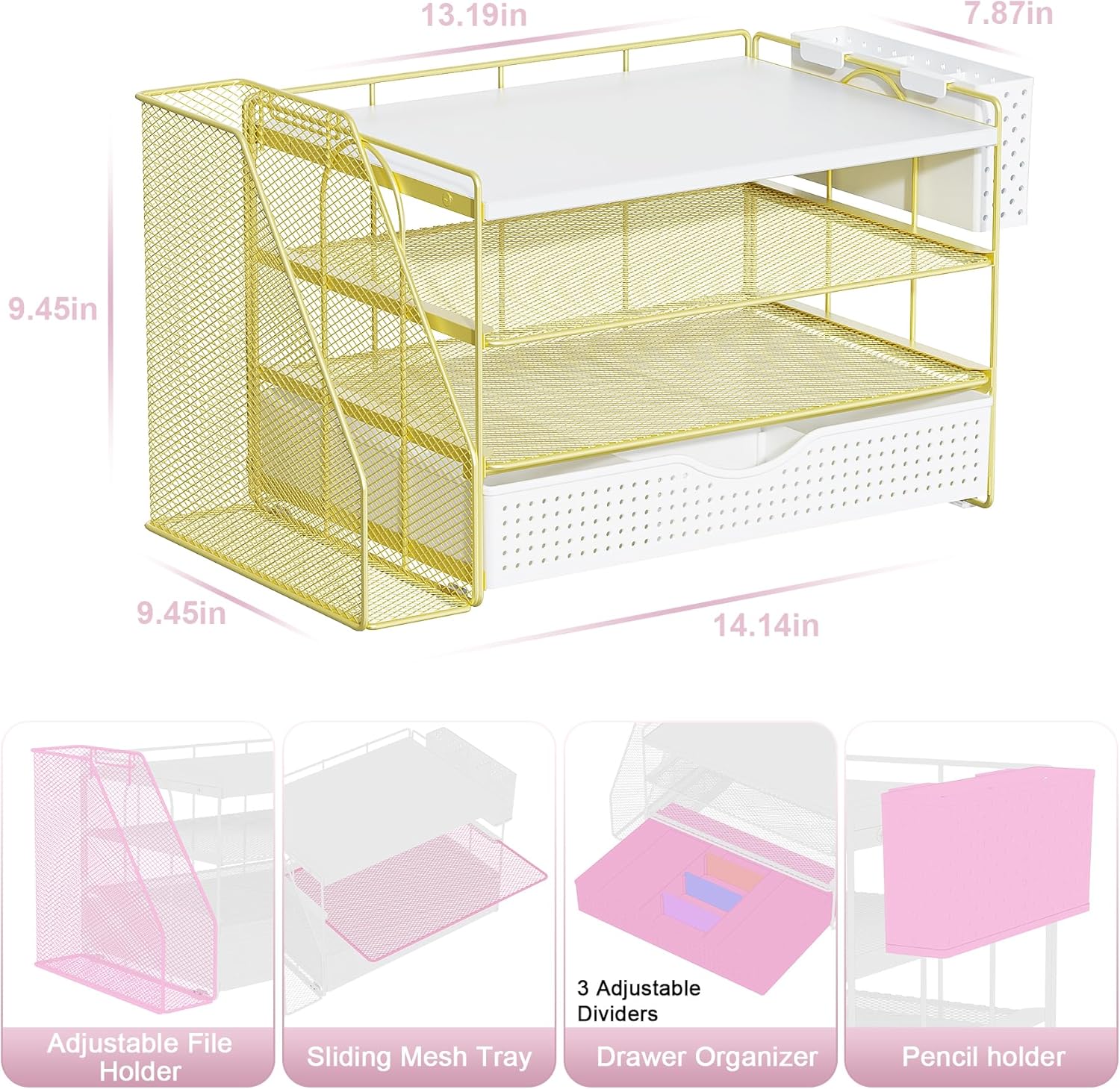 gianotter Wood Desk Organizers and Accessories with File Holder, 4-Tier Desk Accessories & Workspace Organizers with Drawer and Pen Holder, Paper Organizer for Office Supplies (Gold)