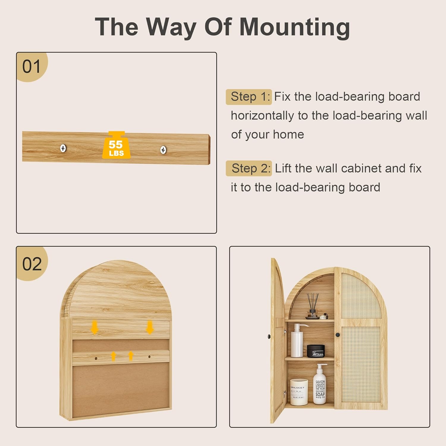 - 【Durable & Sturdy Build 】 This wooden arched bathroom cabinet is crafted from high-quality medium-density fiberboard (MDF) and features adjustable door hinges for durability and proper door alignment. This wall-mounted arched cabinet blends rustic charm with modern durability. With a weight capacity of up to 25 pounds, it's perfect for storing heavy bottles or bulky items