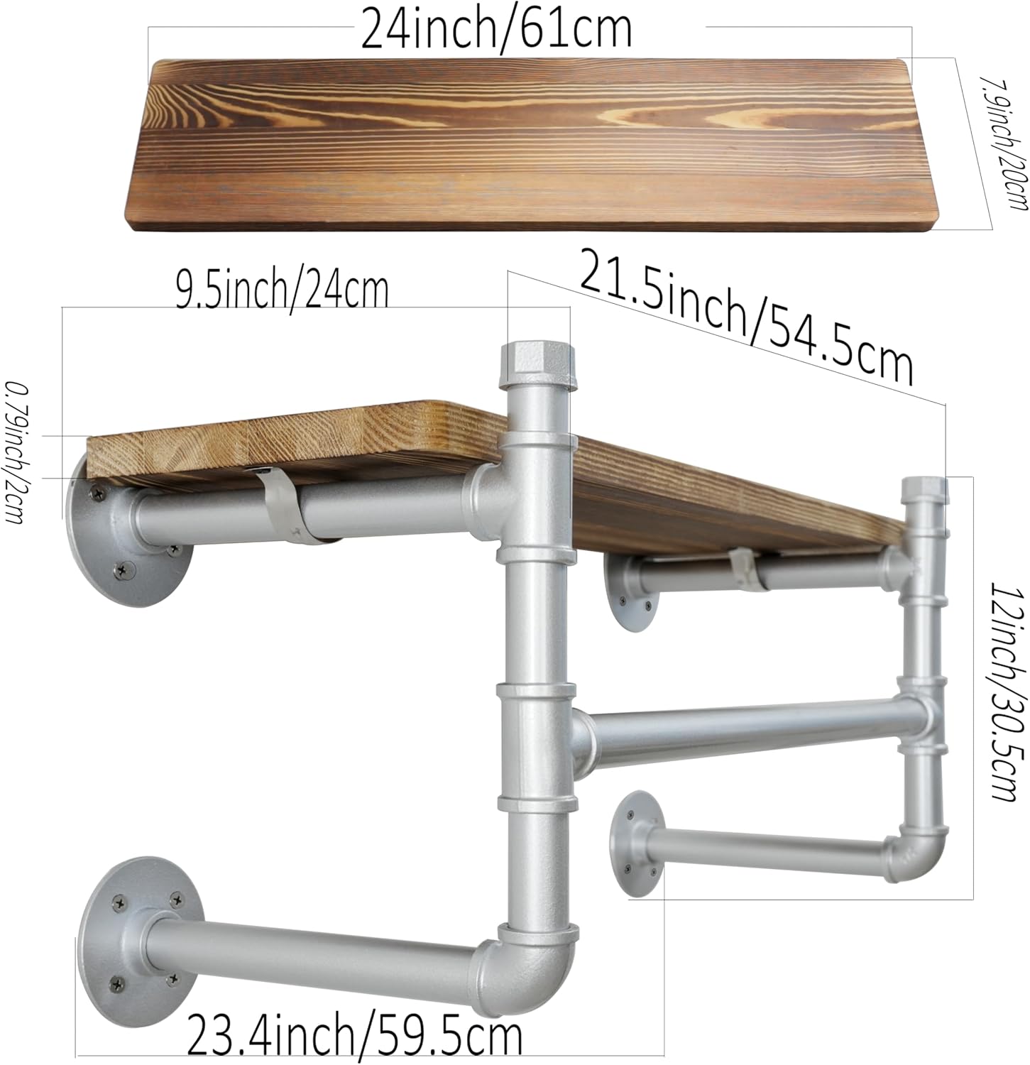 WEBI Wall Mounted Clothes Rack with Shelf,24" Industrial Pipe Clothing Rack with Shelf with Hanging Rod,Heavy Duty Iron Garment Rack Bar,Retail Display Clothes Rod for Laundry Room,Closet,Silver