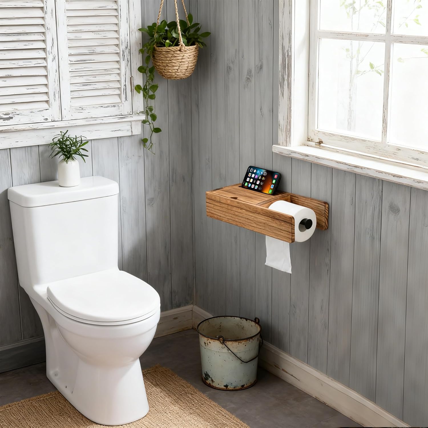 - Farmhouse Design: The rustic toilet paper holder is made of wood with a protective lacquer finish. Each piece is hand-crafted using charcoal-fired techniques, showcasing the unique variations of natural wood grain. The bathroom toilet paper holder is sturdy, perfectly complementing rustic decor