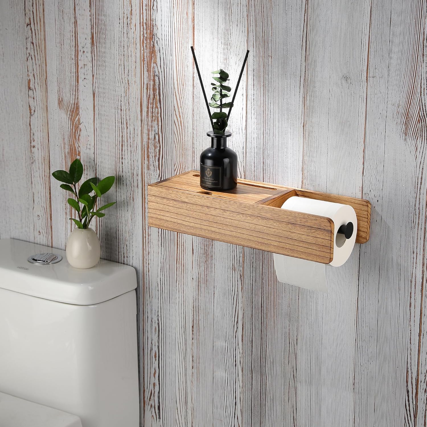 - Hidden Wipes Storage: The adhesive toilet paper holder features a flip-top wooden drawer, providing ample storage for essentials like wet wipes and feminine products—keeping them hidden yet within easy reach. The toilet paper holder with storage helps keep the bathroom neat and organized