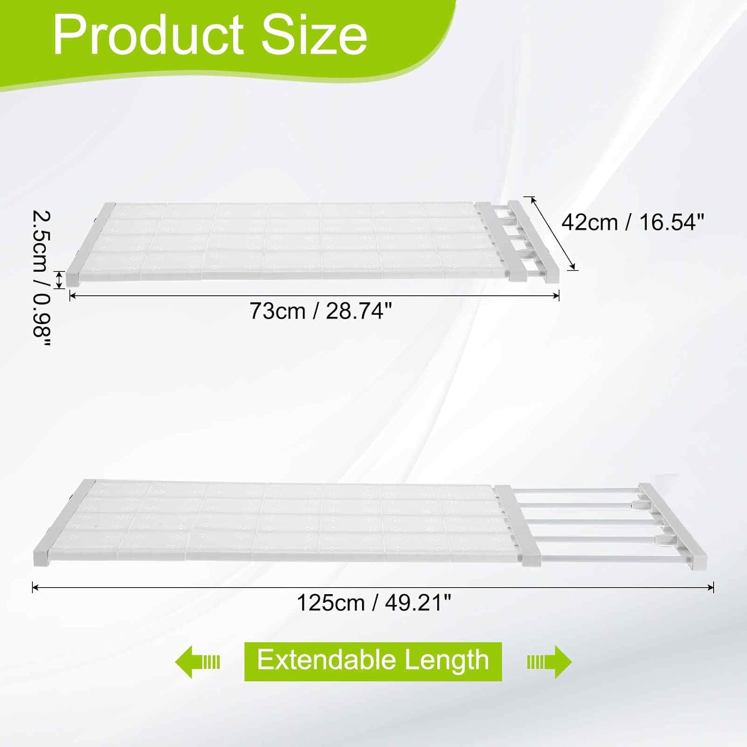 - Size - The closet tension shelf is 28.74 inches to 49.21 inches (73cm to 125cm), 0.91 inches/2.3 cm in height, and 16.54 inches/42cm in width. The adjustable storage rack can be stretched freely in order to fit all kinds of cabinets of different size