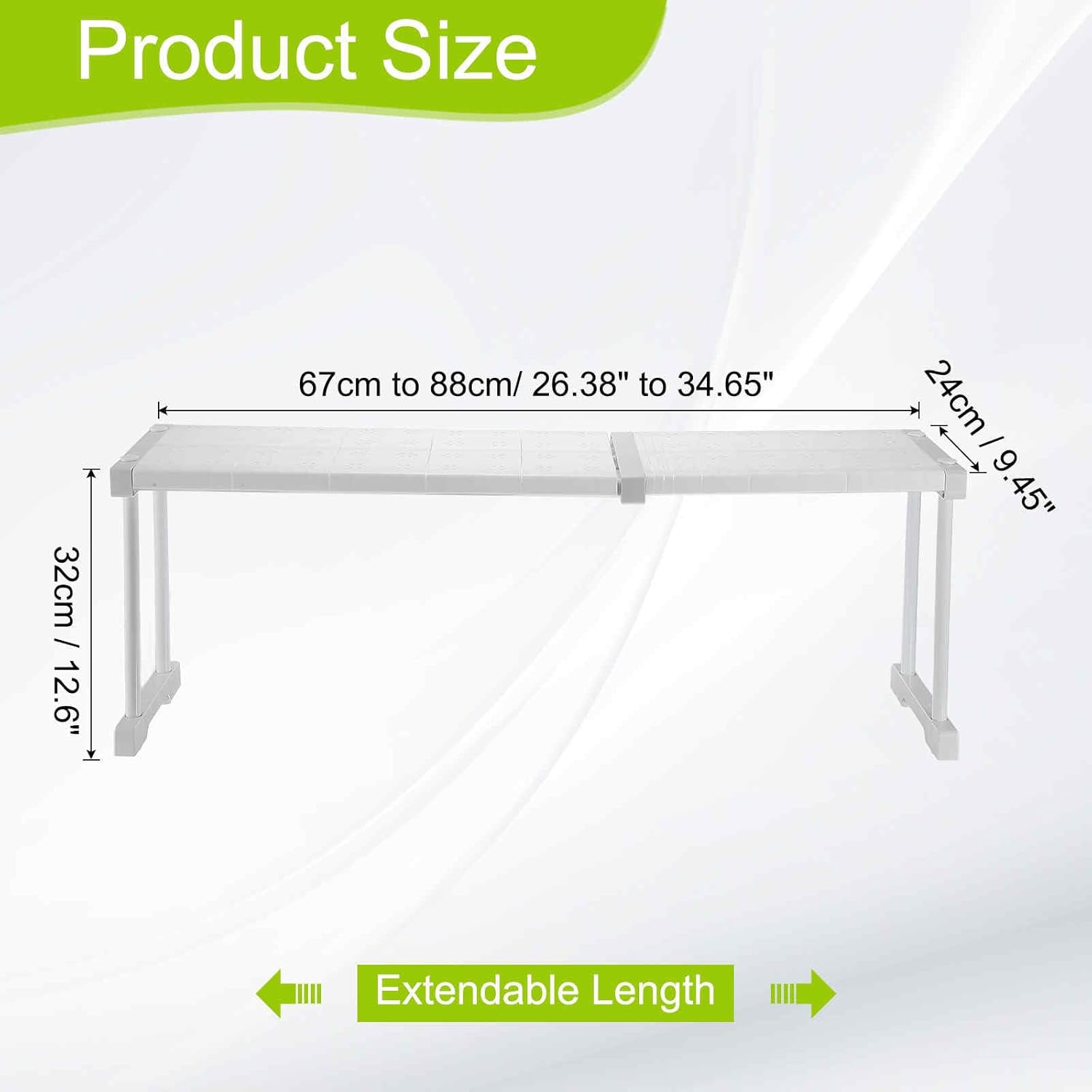 - Size - The closet tension shelf is 26.38 inches to 34.65 inches (67cm to 88cm), 12.6 inches/32 cm in height, and 9.45 inches/24cm in width. The adjustable storage rack can be stretched freely in order to fit all kinds of cabinets of different size