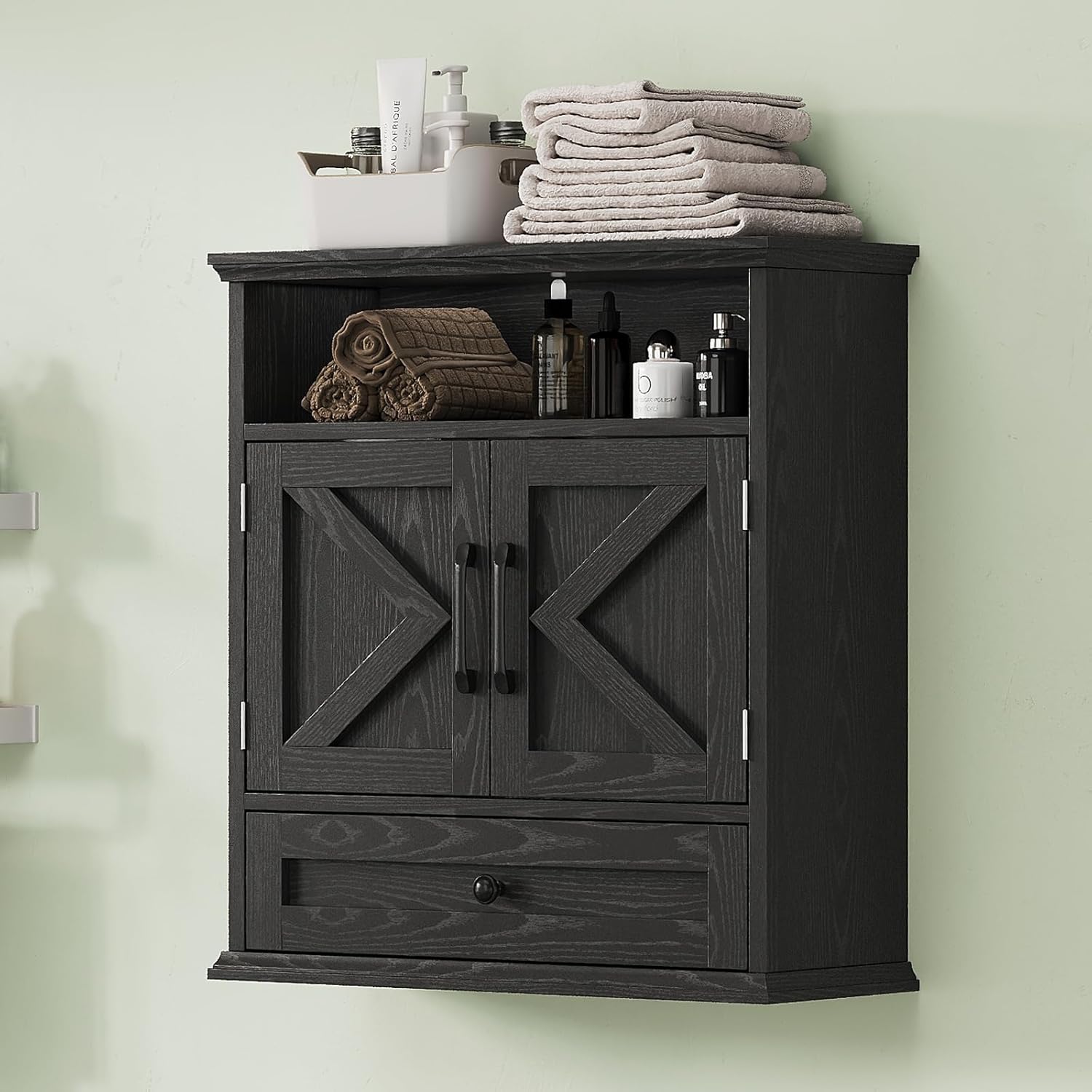 Bathroom Wall Cabinet, Wall Mounted Medicine Cabinet with Drawer, Barn Door & Adjustable Shelf, 24.4"H x 23.6"W x 9"D Black Over Toilet Farmhouse Storage Cabinet for Kitchen, Laundry, Entryway