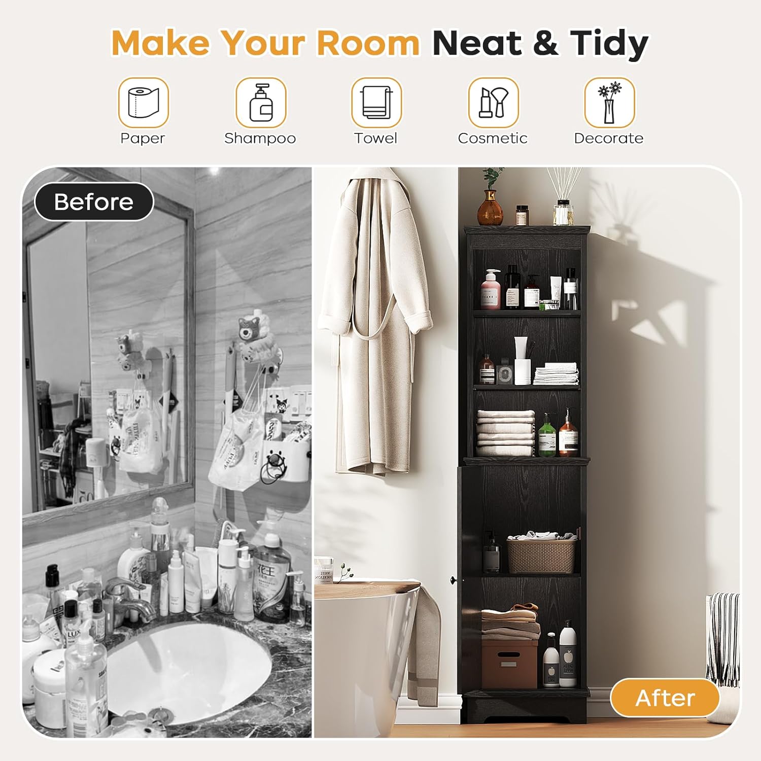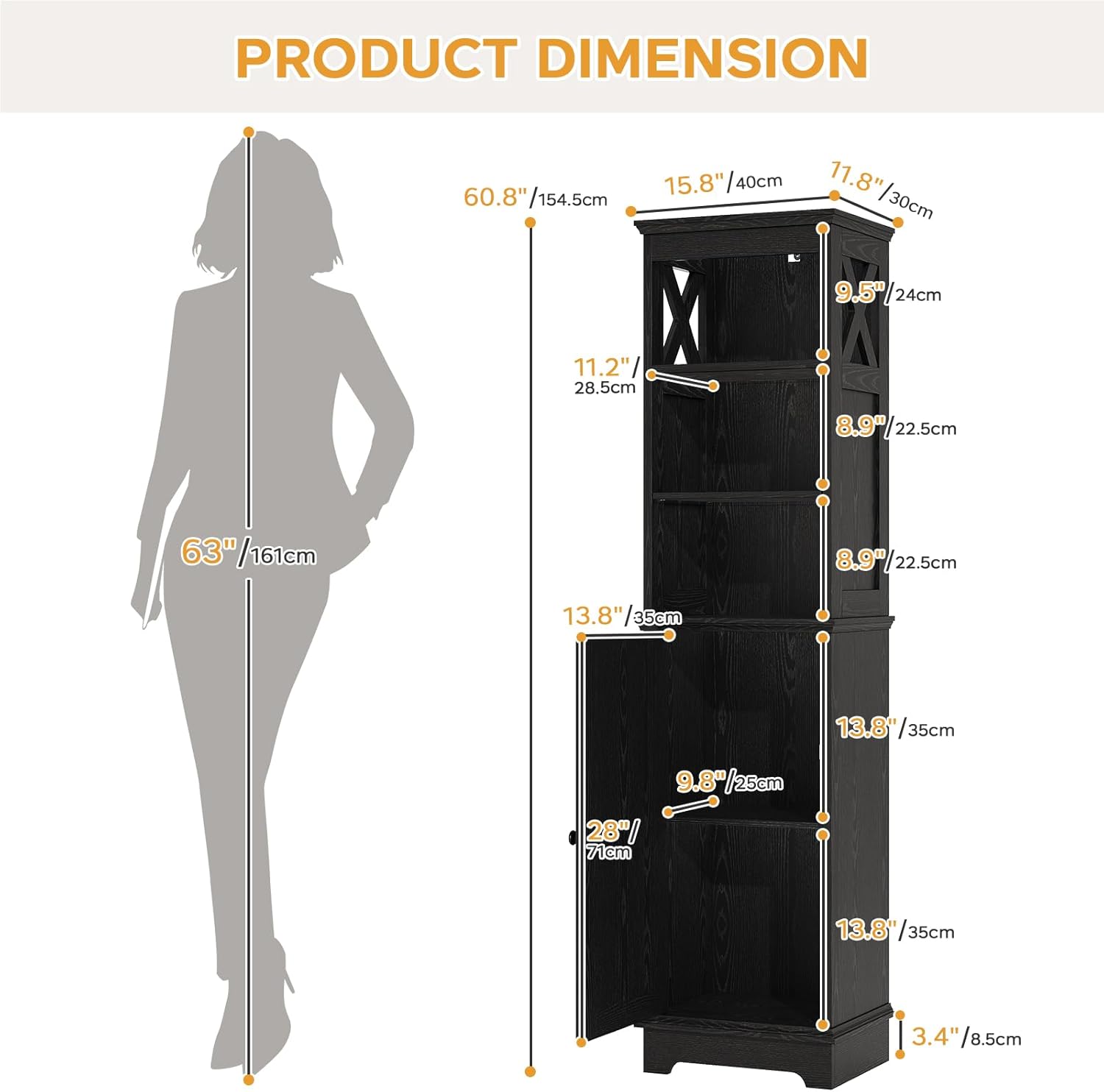 Farmhouse 60.9" H Tall Narrow Storage Cabinet with Door and Open Adjustable Shelves, Freestanding Organizer for Bathroom, Kitchen, Entryway, Wooden Tower Corner Cabinet, Black